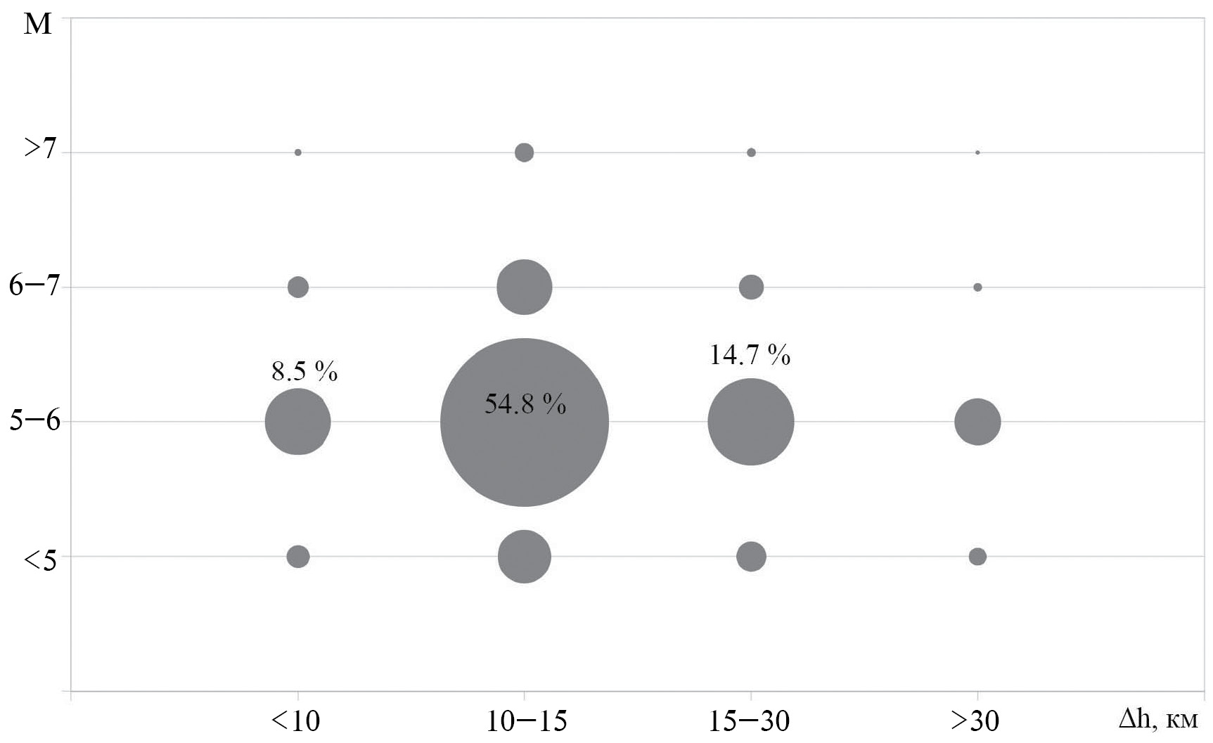 Процентное распределение событий по разнице определения глубин в зависимости от магнитуды Mw показано на рис. 8. Для большинства событий (55%) в диапазоне магнитуд Mw 5–6 погрешности в определении глубины Δh не превышают 15 км, и в других диапазонах магнитуд Mw погрешность также находится в диапазоне Δh < 15 км. Количество событий, для которых Δh > 30 км, не превышает 5%.
