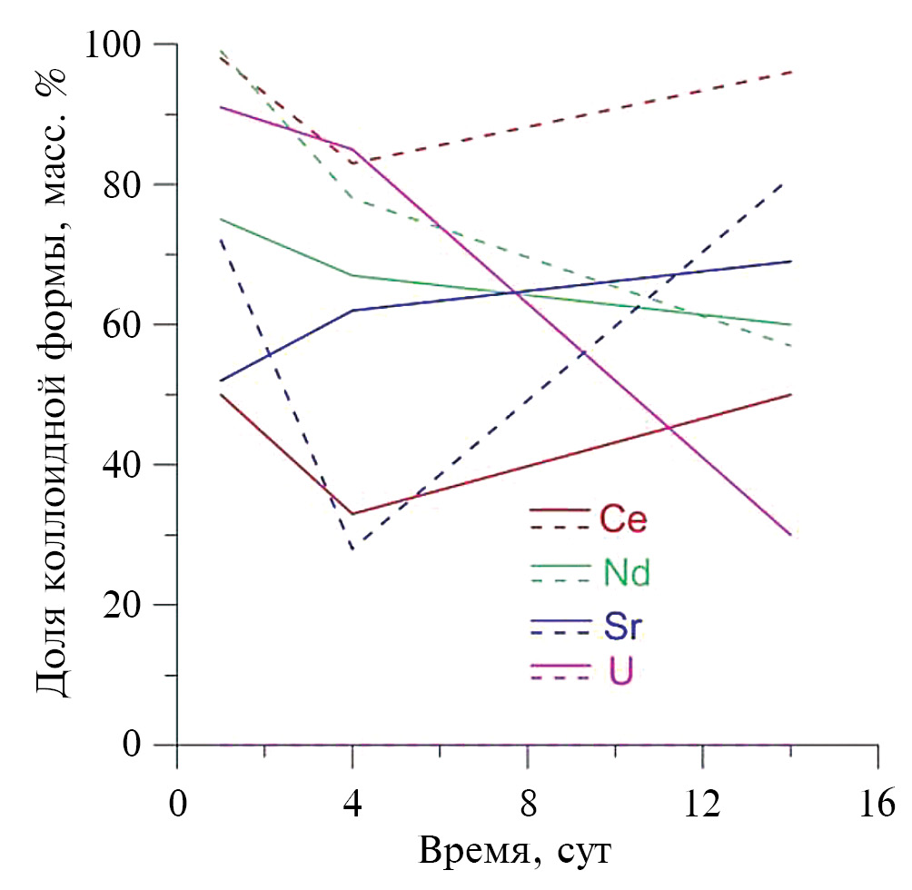 Более половины РЗЭ-имитаторов малых актинидов и стронция содержится в растворе в коллоидной форме. При взаимодействии стекла с бентонитовой водой доля коллоидной фракции РЗЭ выше, чем в дистиллированной воде. При выщелачивании дистиллированной водой доля коллоидной фракции U сначала составляет около 90%, снижаясь затем до 25%. Коллоидная фракция U в продуктах выщелачивания стекла бентонитовой водой отсутствовала.