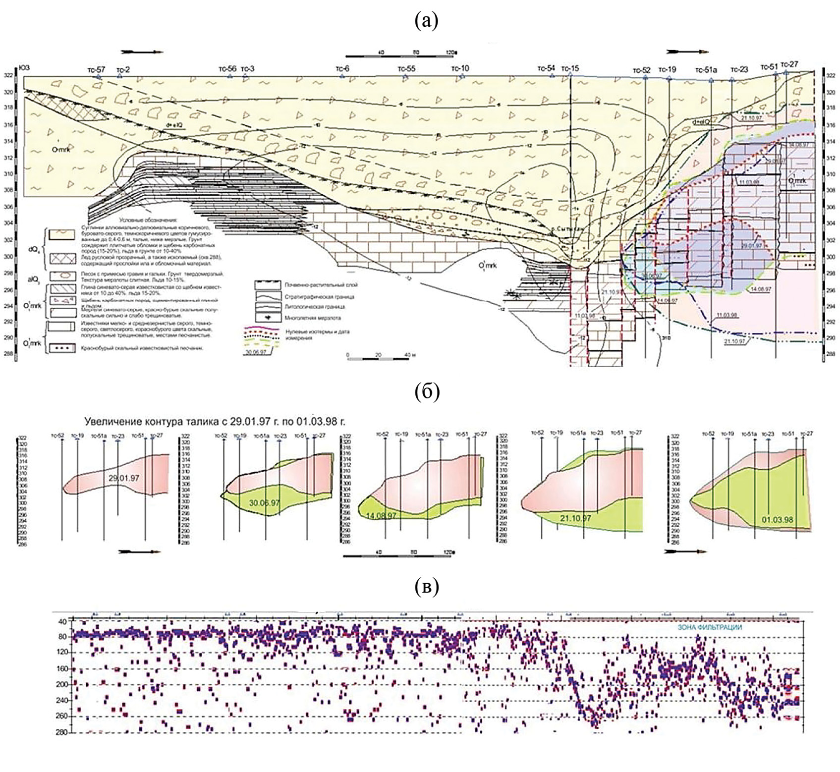 Рис. 1. Геологический разрез (а), нулевые изотермы и динамика изменения контура талика (б), радарограмма (в) по оси Сытыканской плотины, 1997–1998 гг. [1]
