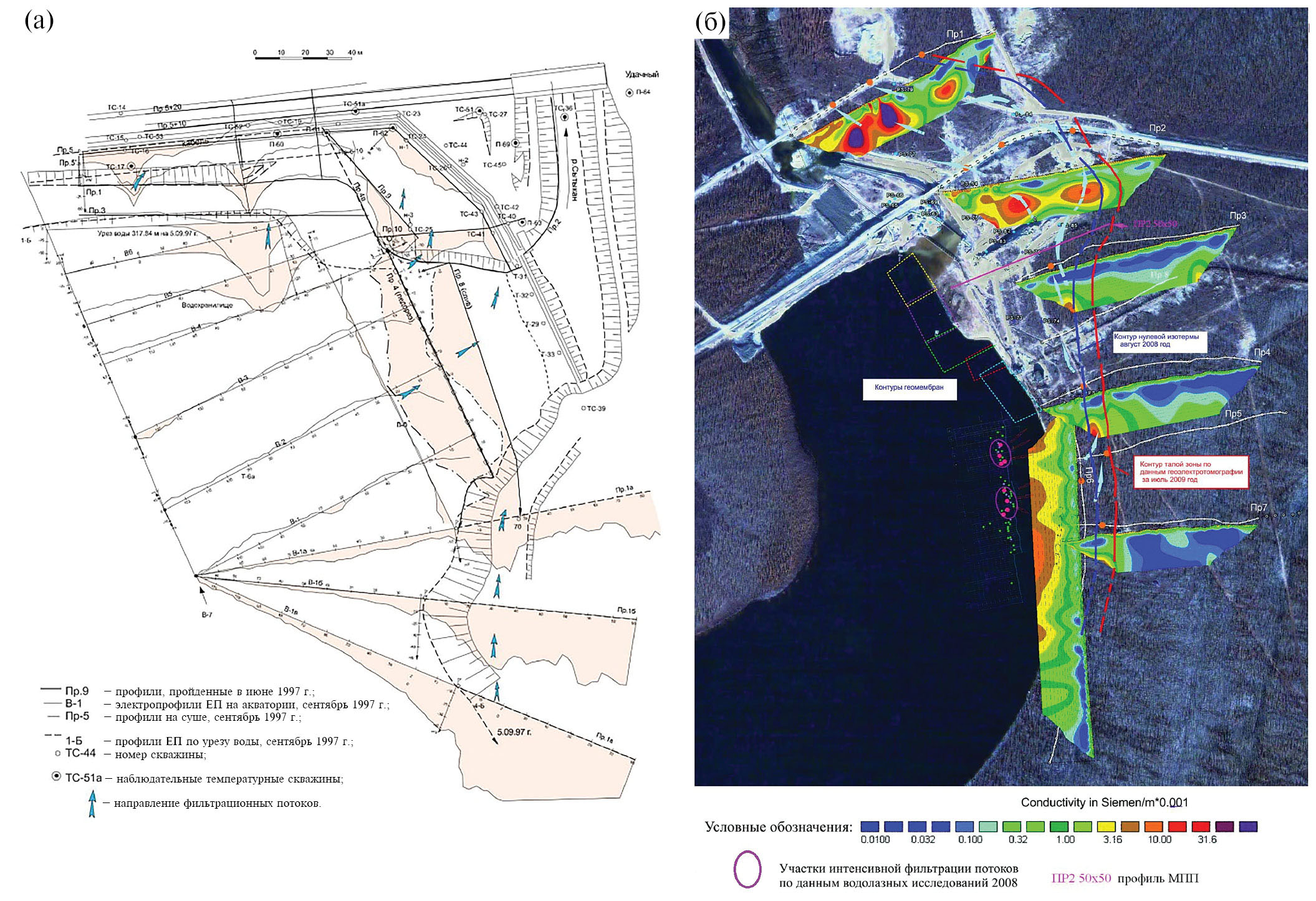 Рис. 2. Сытыканский гидроузел: а - распространение отрицательных аномалий потенциала естественного электрического поля (ЕП) в верхнем бьефе водохранилища; отрицательным аномалиям соответствуют зоны инфильтрации [1]; б - площадной контроль обходной фильтрации в талой зоне правобережного примыкании по совместной интерпретации данных скважинной термометрии и электротомографии [2].