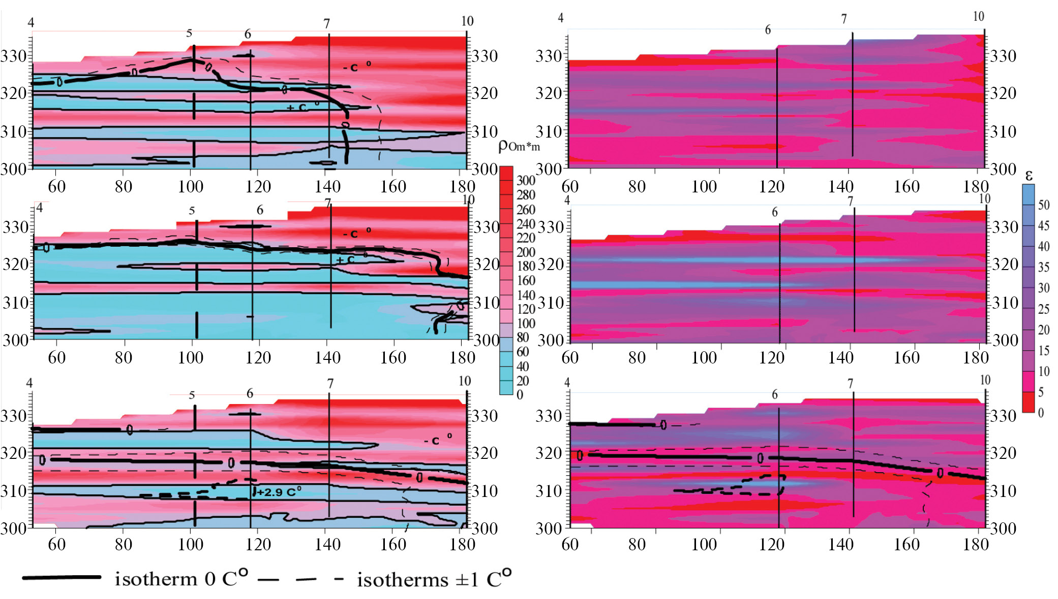 Рис. 3. Примеры геоэлектрических разрезов: слева – эффективных сопротивлений (ρ); справа – относительной диэлектрической проницаемости (ε), по профилю скважин (4–5–6–7–10) в мерзлом массиве в крест береговой линии Сытыканского гидроузла (Зап. Якутия); ОРВП наблюдения: вверху – март 2001; в середине – август 2001; внизу – март 2002. Для мерзлых пород характерно высокое ρ и низкое ε; для талых — низкое ρ и высокое ε. Уровень дна около плотины 301 м [19, 26]. По горизонтальным осям расстояние от береговой линии, по вертикальным — абсолютные отметки глубины, [м].