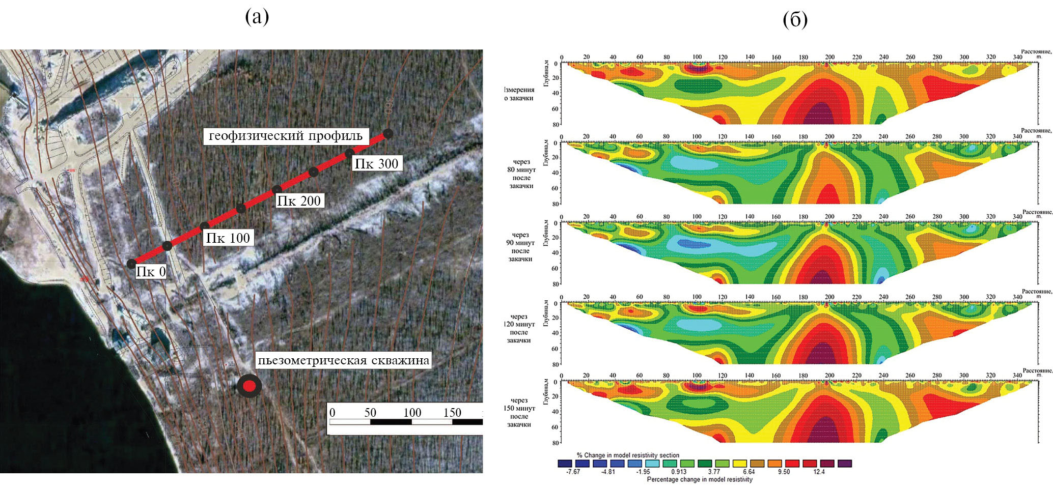 Рис. 4. Схематическое расположение наблюдательного профиля и пьезометрической (закачной) скважины, правобережного примыкания водохранилища Сытыкан, Зап. Якутия (а). Режимные (повторные) электротомографические измерения для выявления фильтрационных окон и скоростей фильтрации. Окно фильтрации на глубине 25 м в районе ПК100м на 90 мин после закачки (б) [2].