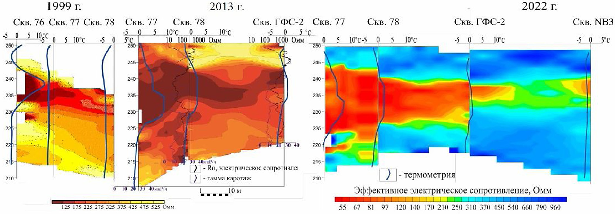 Рис. 5. Геоэлектрические разрезы по результатам РВГИ: 1999–2022 гг. с диаграммами гамма каротажа и электрического сопротивления. Приведена термометрия по скважинам за 1999, 2013 и 2022 г. [3]
