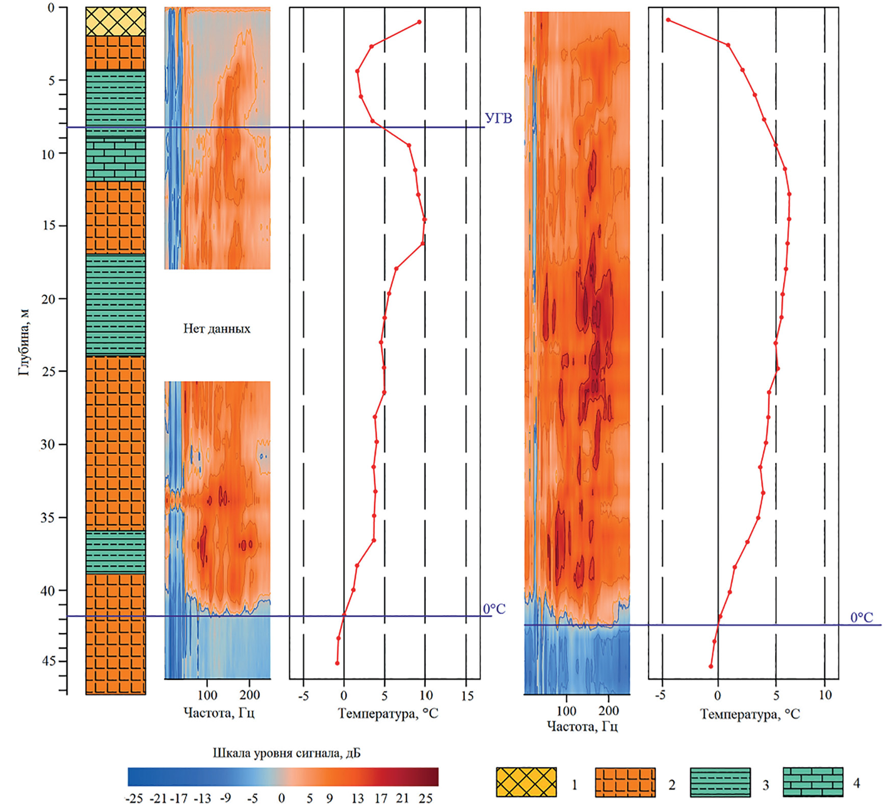 Эти исследования в последние годы были дополнены регистрацией микросейсм, связанных с работой турбин ВГЭС-1,2 [7]. Анализ результатов измерений амплитуд микросейсмического сигнала в скважинах (рис. 6) показал, что для высокоскоростных слоев грунтовых толщ, температура которых ниже нуля (при прочих равных условиях), амплитуда сигнала существенно меньше амплитуды на растепленных низкоскоростных грунтах (разница при этом может составлять 25 дБ и более). Причем наблюдения, сделанные в разное время года (при наличии и отсутствии воды в грунте), позволяют выявлять зоны с аномально высокой амплитудой сигнала в талой части скважины, что дает возможность связать выявленные участки с областями повышенной трещиноватости грунтового массива. Эти области можно объяснить результатом влияния фильтрационных потоков на грунты правобережного примыкания Вилюйской ГЭС-1,2. Отмечено [7], что большая амплитуда сигнала фиксируется в основном в высокочастотной части спектра (110–200 Гц). В то же время наблюдаемые аномалии в мерзлых грунтах меньше по амплитуде (0.7–5.0 дБ), но частотный диапазон немного шире (70–210 Гц). В границах этих областей с учетом данных термометрии можно прогнозировать возникновение негативных инженерно-геокриологических процессов несмотря на то, что температура грунтов пока еще находится ниже нулевой отметки. Таким образом, как и в случае с радиоволновыми исследованиями, можно говорить об опережающем температурном прогнозе развития талика. Результаты исследований свидетельствуют о сложной внутренней картине взаимодействия вод гидросооружения с трещиноватой мерзлой–талой толщей.