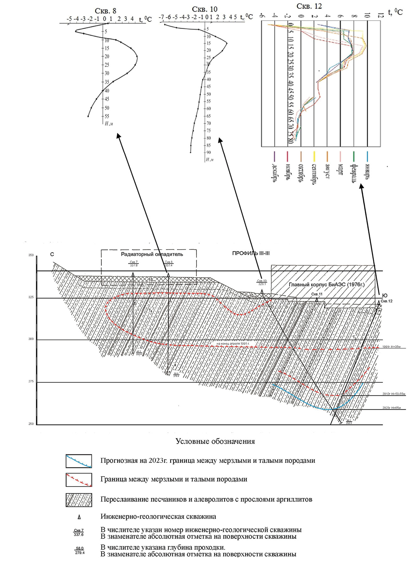 Территория исследования сложена трещиноватыми скальными породами верхнетриасового возраста, представленными песчаниками, алевролитами и аргиллитами. На рис. 7 приведен геологический разрез по профилю III–III с расположением режимных термометрических скважин (ВНИИОСП, https://niiosp.ru/ru/) на участке I очереди АЭС (скв. 7, 8, 10 и 12), последние две скважины – под Главным корпусом АЭС. В скв. 3, расположенной возле Радиаторного охладителя, максимальная температура в 1991 г. составляла +4°С, а в 2012 г. уже +8°С. Чаша оттаивания по данным термометрических скважин, расположенных вблизи Главного корпуса и сооружений Радиаторного охладителя, развивалась во времени, и за 20 лет глубина ее увеличилась примерно на 20 м, т.е. в среднем 1 м в год. Самые последние доступные результаты термометрии относятся к 2012 г. В термометрической скв. 8 глубина оттаивания на 1991 г. составляла 40 м от поверхности под сооружениями Радиаторного охладителя и 30–35 м (скв. 12) под Главным корпусом БиАЭС, а в 2012 г. в скв. 12 глубина оттайки достигла 55 м (см. рис. 7). Необходимо отметить неоднородность интенсивности прогрева пород под разными сооружениями БиАЭС, а именно, снижение температуры от Главного корпуса реакторного отделения до зоны Радиаторного охладителя, что и определило латеральную неоднородность оттаивания скального основания1.