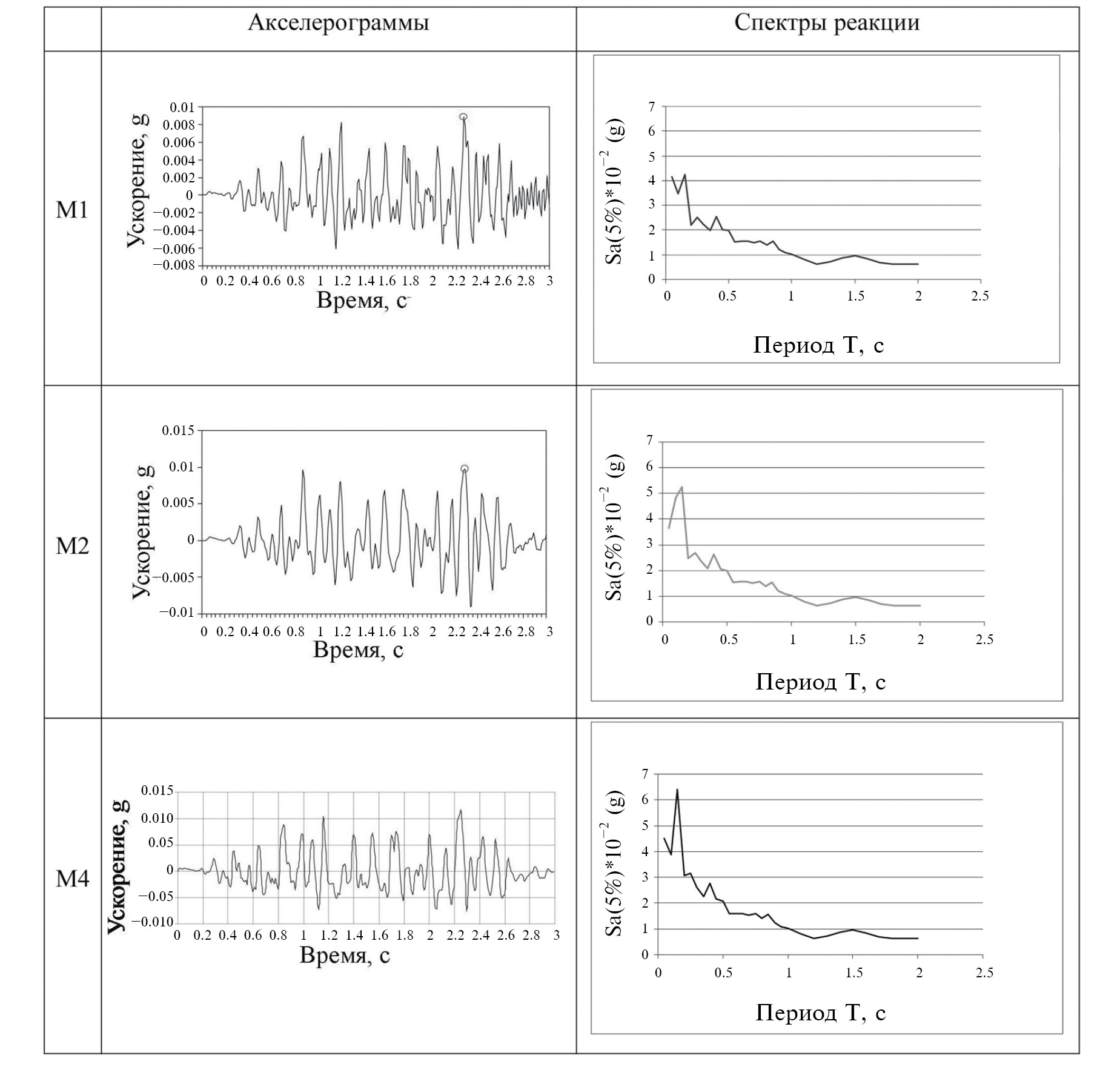 Рис. 8. Примеры расчетных акселерограмм и соответствующих им спектров реакции Sa (5%) · 10-2 в долях g от предполагаемого местного землетрясения: М1 (модель 1) - на поверхности толщи мерзлых скальных пород площадки БиАЭС (Аmax = 9.1 см/с2); М2 (модель 2) - на поверхности оттаявшей толщи скальных пород при общей глубине оттаивания 35 м в 1991 г. (Аmax = 10.0 см/с2); М4 (модель 4-прогнозная) - на поверхности при прогнозной общей глубине оттаивания 65 м к 2023 г. (Аmax = 12.0 см/с2).