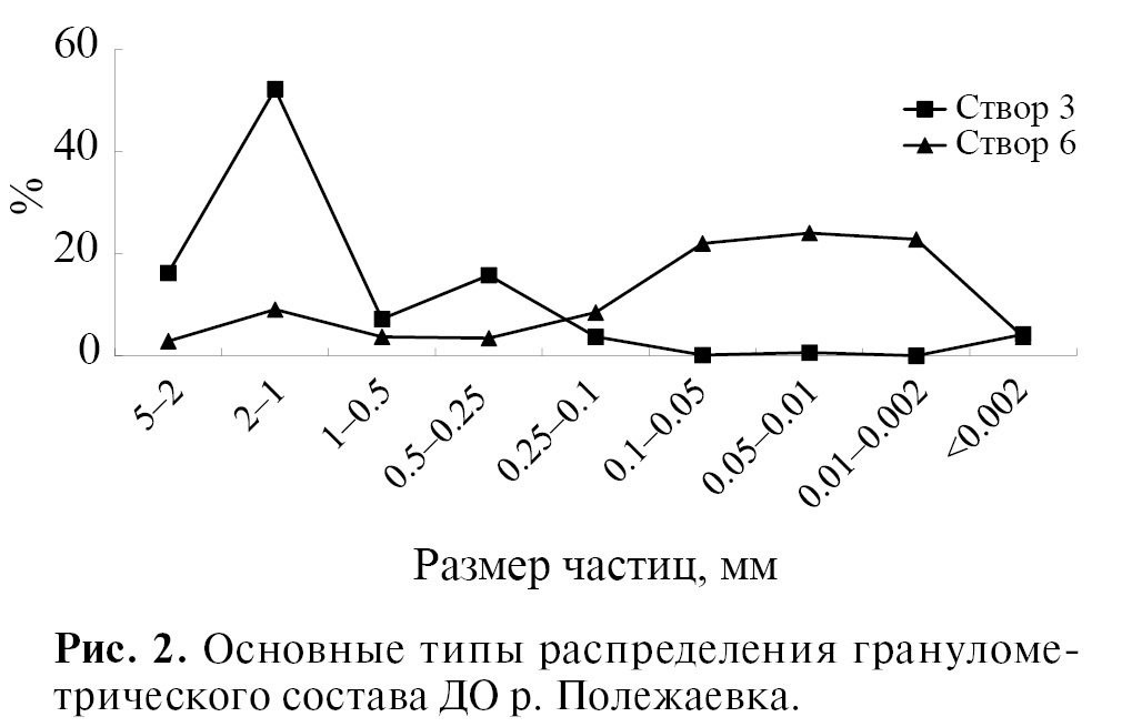 Мощность слоя ДО на разных участках Полежаевки неоднородна и зависит от морфометрии участка и гидрологических характеристик водотока. В створах с широким руслом, характеризующихся замедленным течением реки, в ДО повышается доля мелкодисперсных фракций (рис. 2). Доминируют в последнем случае частицы размером 0.1–0.01 мм, составляющие до 68% в составе ДО. Доля физической глины (< 0.002 мм) в образцах ДО не превышает 4.18%.