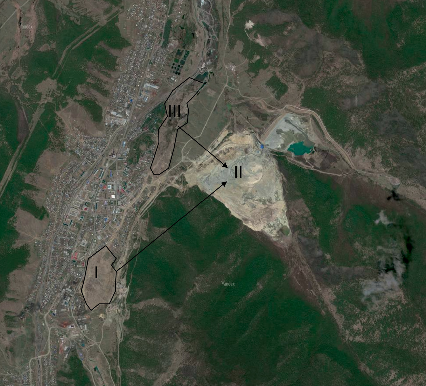 Рис. 1. Космический снимок территории хвостохранилищ (2010 г.): I – насыпное, II – намывное (гидроотвал), III – аварийное.