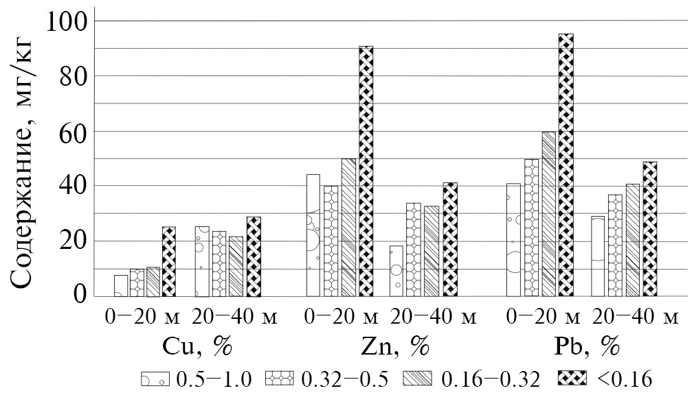 Цинк, медь и свинец содержатся в больших количествах в исследованных техногенных песках и поэтому являются основными токсикантами и загрязнителями [7]. Из анализа данных диаграммы распределения ионообменных форм тяжелых металлов (рис. 3) следует зависимость содержания форм Cu, Zn и Pb от гранулометрического состава, которая рассматривалась выше. На глубине 0–20 м эта зависимость более выражена по сравнению с содержанием элементов в ионообменной форме на глубине 20–40 м. Вероятно, данный факт обусловлен тем, что с течением времени химические процессы в более нижних слоях пришли в равновесие, техногенные пески слежались и более не подвергаются различным процессам (ветровая и водная эрозия, замерзание/оттаивание и т.п.) в отличие от вышележащего слоя песков.