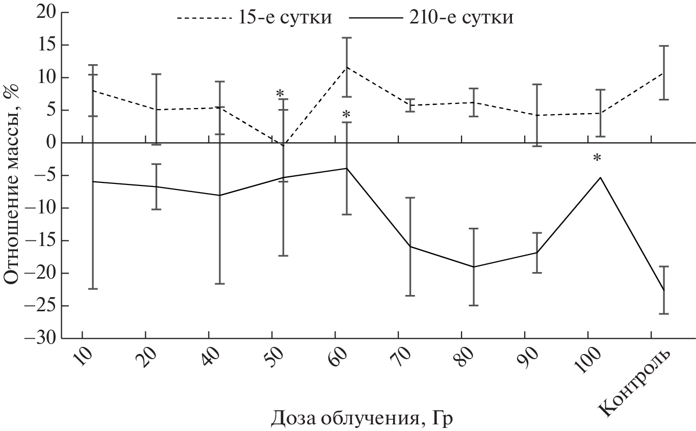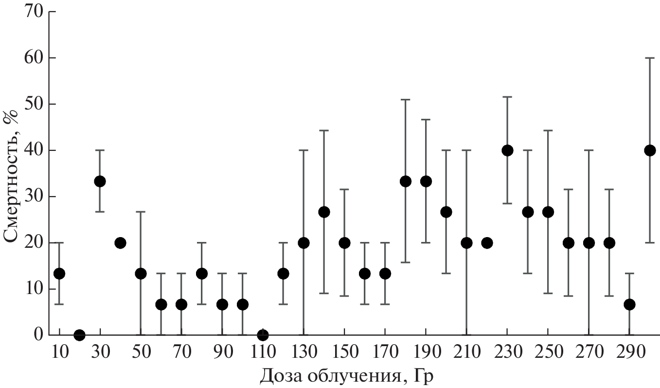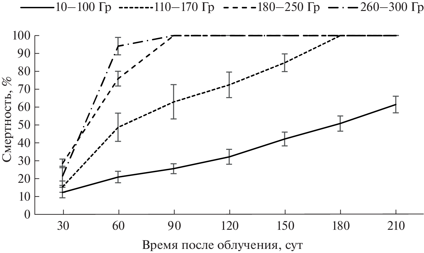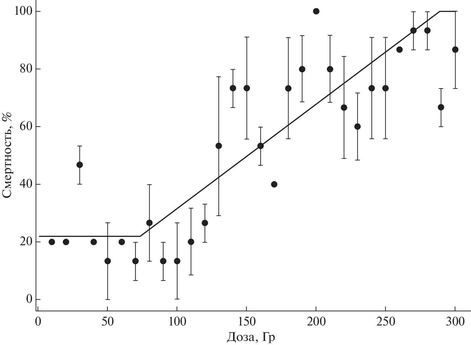The results of the study of relevant indicators of mortality and biomass after ɣ-irradiation in the dose of 10–300 Gy of the terrestrial mollusk F. fruticum M. are presented. Mollusks of the second age group were selected. The age of the mollusks was determined by the number of revolutions of the shell. The conditions of keeping the mollusk in the laboratory were experimentally selected in such a way that the survival rate in the control group was 100%. The duration of the experiment (210 days) and the range of radiation doses (10–300 Gy) made it possible to establish the LD50/60 index for a terrestrial mollusk of the second age group. It is 115.6 ± ± 33.8 Gy. LD50/60 was determined by the calculated method of probit analysis using the least squares method. Three dose ranges (10–100, 110–170 and 180–300 Gy of changes in the studied relevant indicators were established. For each time range, starting from 60 days after irradiation, a linear threshold dependence with three dose ranges was established: a dose-independent plateau at low radiation doses, a dose-dependent range with an increase in the radiation dose, and a dose-independent plateau when absolute mortality occurs.