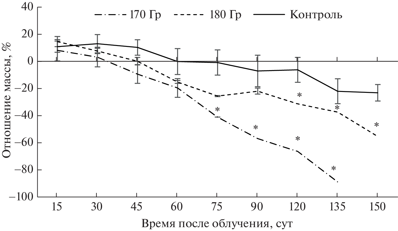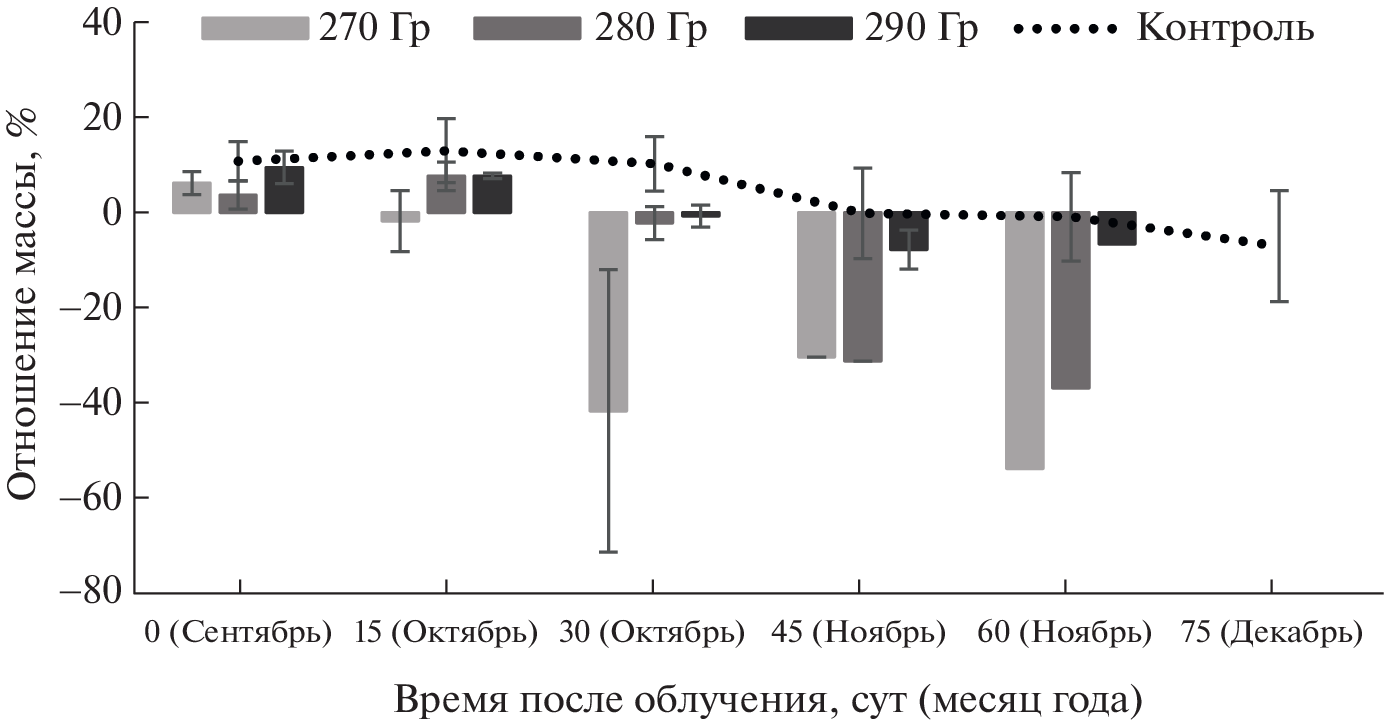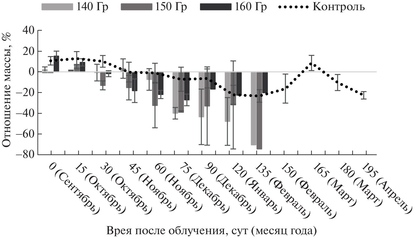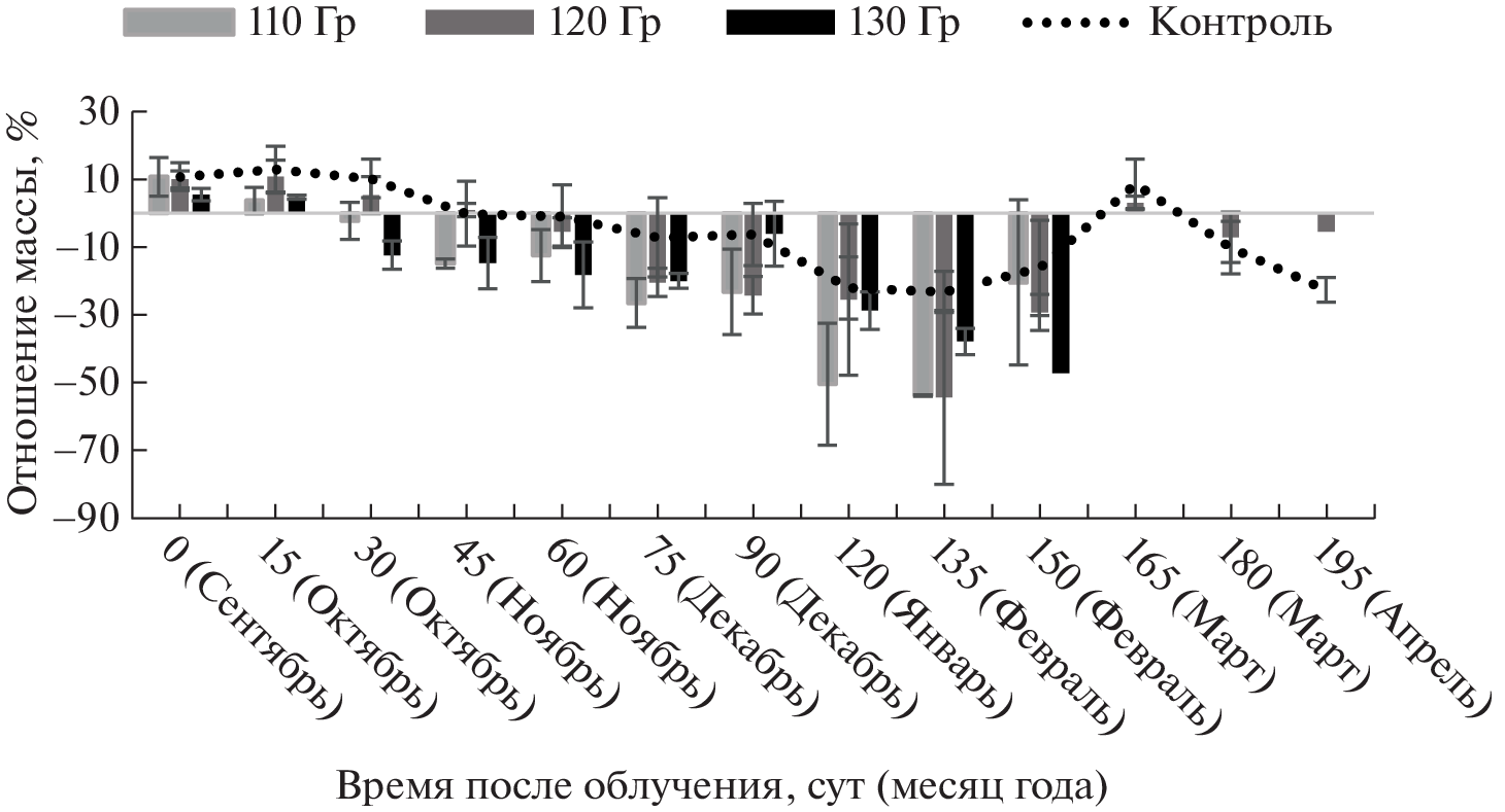 The results of the study of relevant indicators of mortality and biomass after ɣ-irradiation in the dose of 10–300 Gy of the terrestrial mollusk F. fruticum M. are presented. Mollusks of the second age group were selected. The age of the mollusks was determined by the number of revolutions of the shell. The conditions of keeping the mollusk in the laboratory were experimentally selected in such a way that the survival rate in the control group was 100%. The duration of the experiment (210 days) and the range of radiation doses (10–300 Gy) made it possible to establish the LD50/60 index for a terrestrial mollusk of the second age group. It is 115.6 ± ± 33.8 Gy. LD50/60 was determined by the calculated method of probit analysis using the least squares method. Three dose ranges (10–100, 110–170 and 180–300 Gy of changes in the studied relevant indicators were established. For each time range, starting from 60 days after irradiation, a linear threshold dependence with three dose ranges was established: a dose-independent plateau at low radiation doses, a dose-dependent range with an increase in the radiation dose, and a dose-independent plateau when absolute mortality occurs.