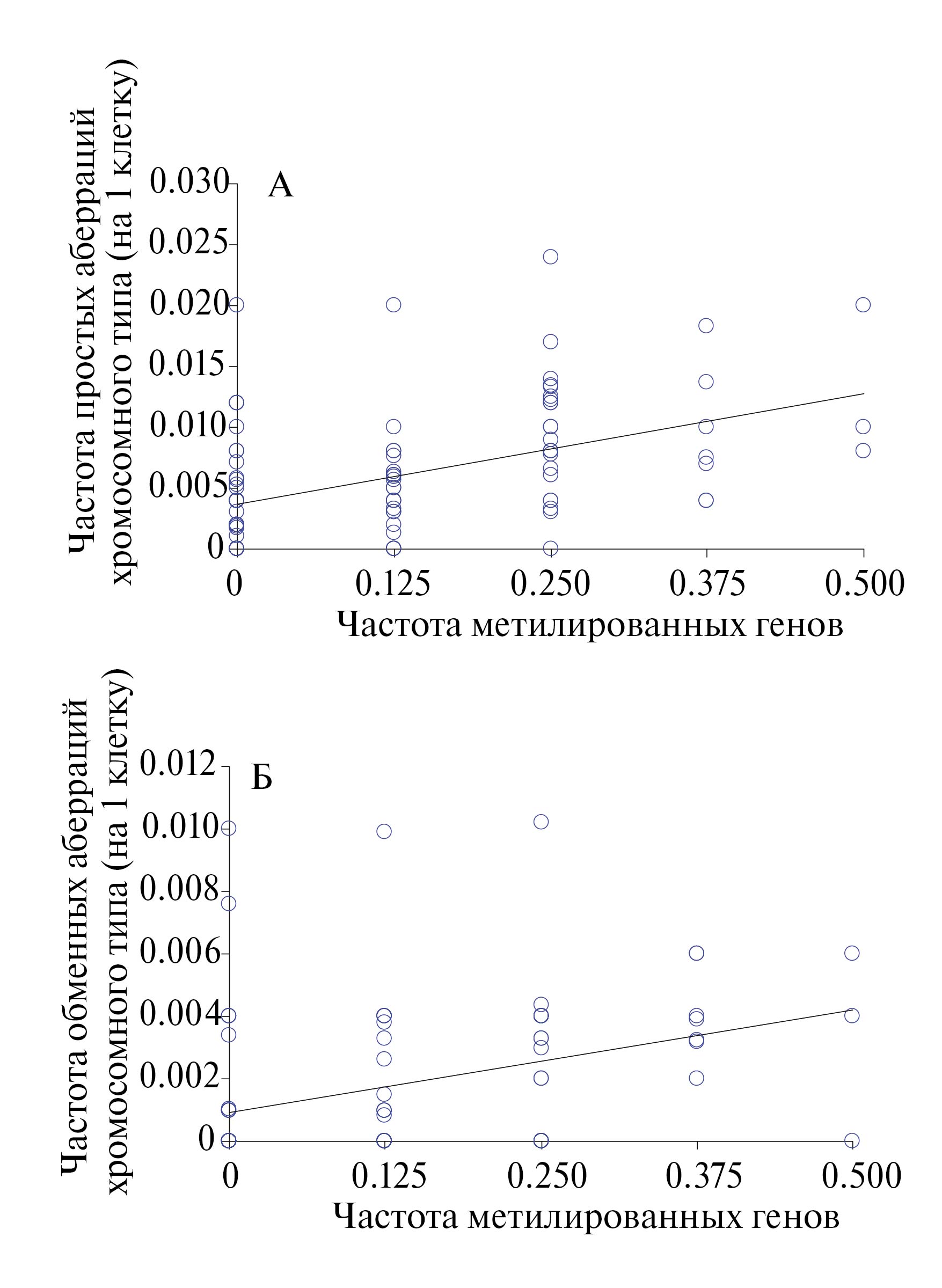 Рис. 2. Зависимость уровня аберраций хромосомного типа от частоты метилированных генов у облученных лиц: А – простые аберрации хромосомного типа; Б — обменные аберрации хромосомного типа.