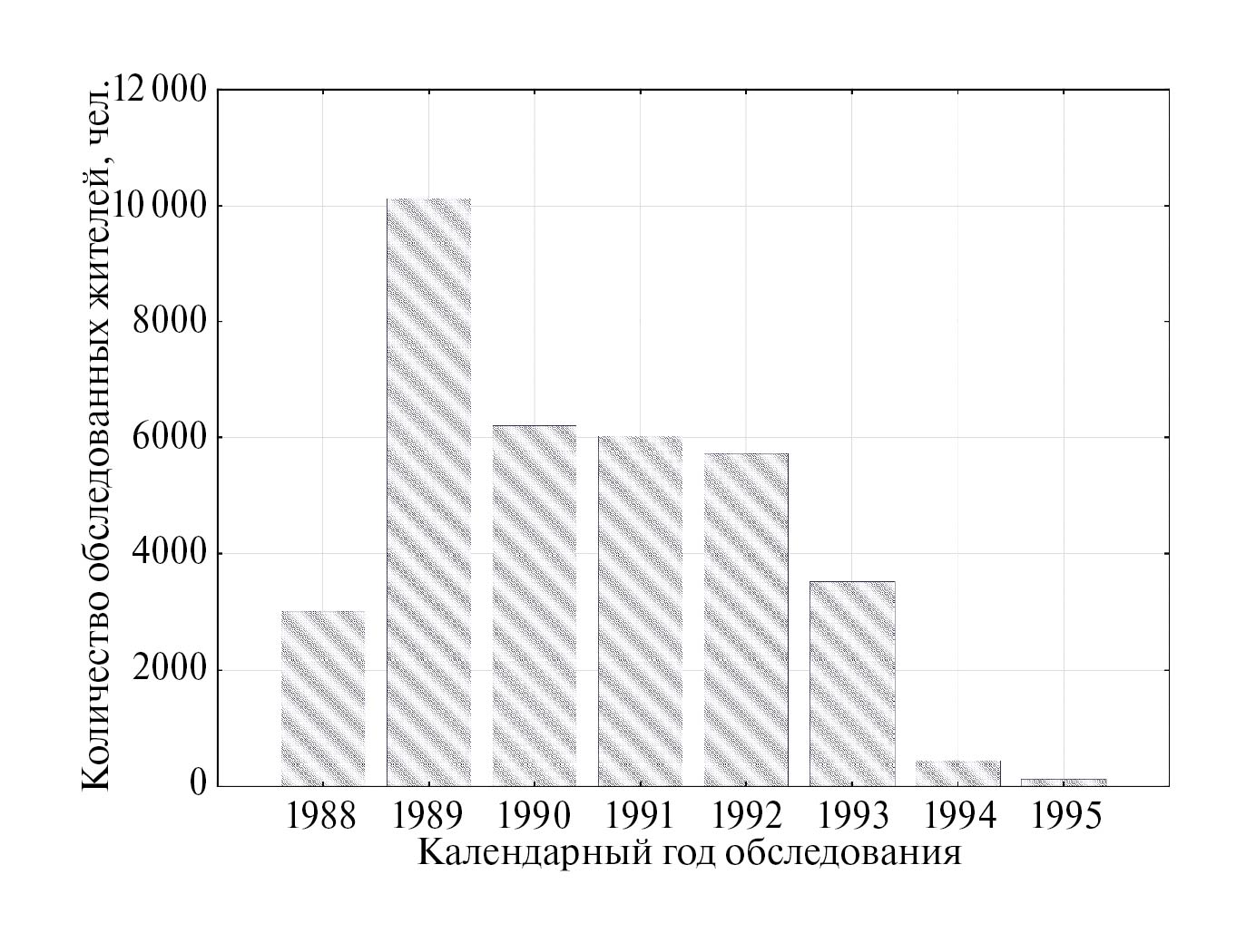 Представлены данные об инструментально полученных индивидуальных дозах внешнего облучения более 35 000 жителей Гомельской области (представительность обследованных лиц по гендерному признаку приблизительно одинаковая) методом индивидуального дозиметрического контроля сотрудниками Гомельского областного центра гигиены, эпидемиологии и общественного здоровья, а также сотрудниками ФГБУ ГНЦ ФМБЦ им. А.И. Бурназяна ФМБА России за период 1988–1995 гг.