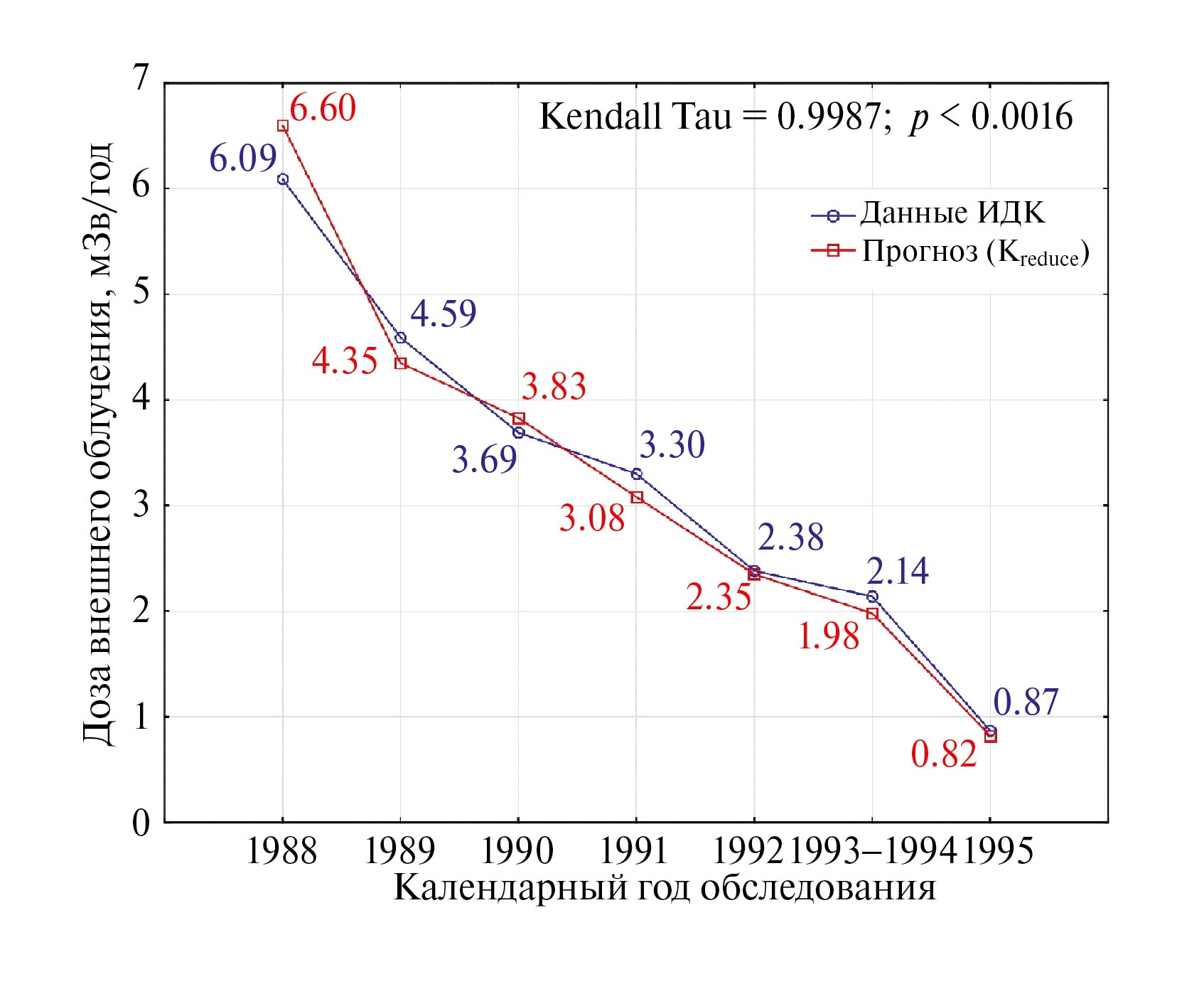 Коэффициент снижения (Kreduce) рассчитывали как отношение среднего значения дозы внешнего облучения текущего года к предшествующему (2).