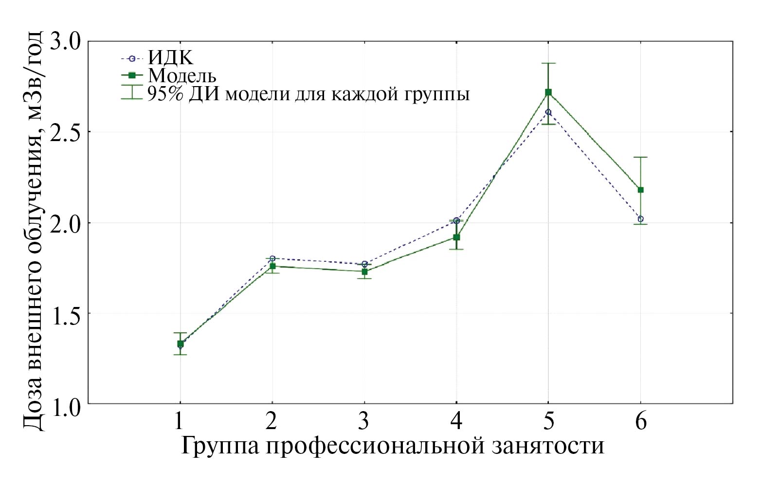 Сравнительный анализ модельных индивидуализированных доз внешнего облучения для групп профессиональной занятости с данными ИДК (см. рис. 6) также показал, что между ними не наблюдается статистически значимых различий, при этом оценка ошибки модели составила в среднем ±5%.
