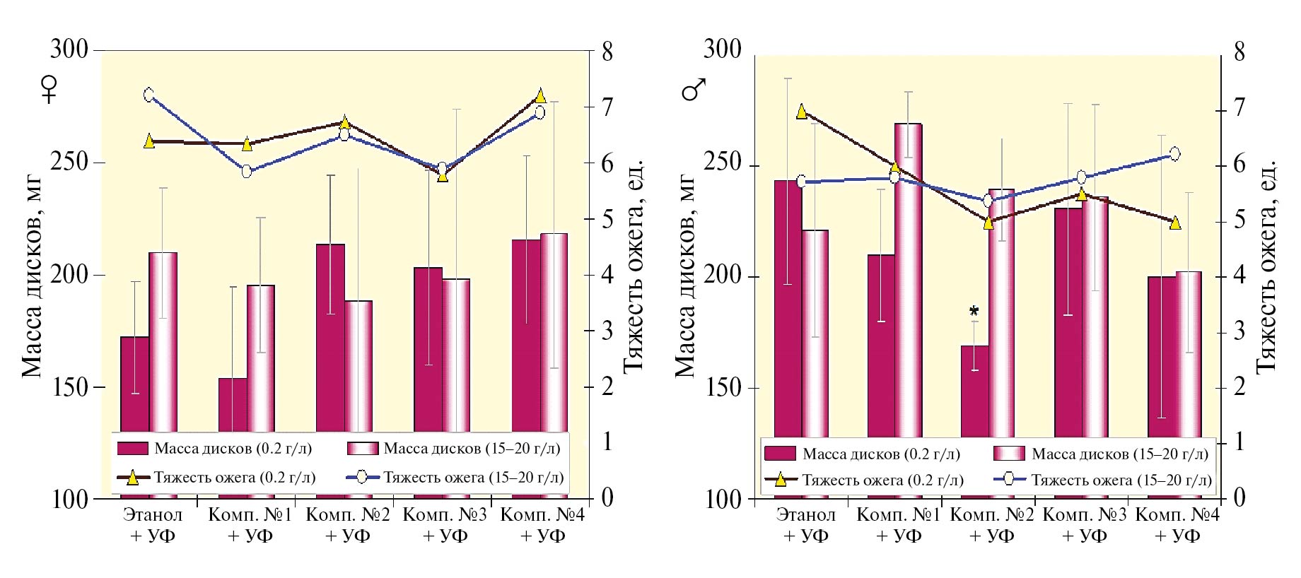 Сравнение массы кожных дисков при 0.2 г/л и 15–20 г/л (как у ♀, так и ♂) не показало четкой тенденции как при сравнении композиций между собой, так и с соответствующим УФ-контролем. В отличие от толщины кожной складки и массы дисков, при концентрации 15–20 г/л у самок по величинам тяжести ожога для композиций во многом сохранялась тенденция, наблюдаемая при концентрации 0.2 г/л, а наименее существенные различия между концентрациями были для композиций № 2–№ 4 (рис. 1).