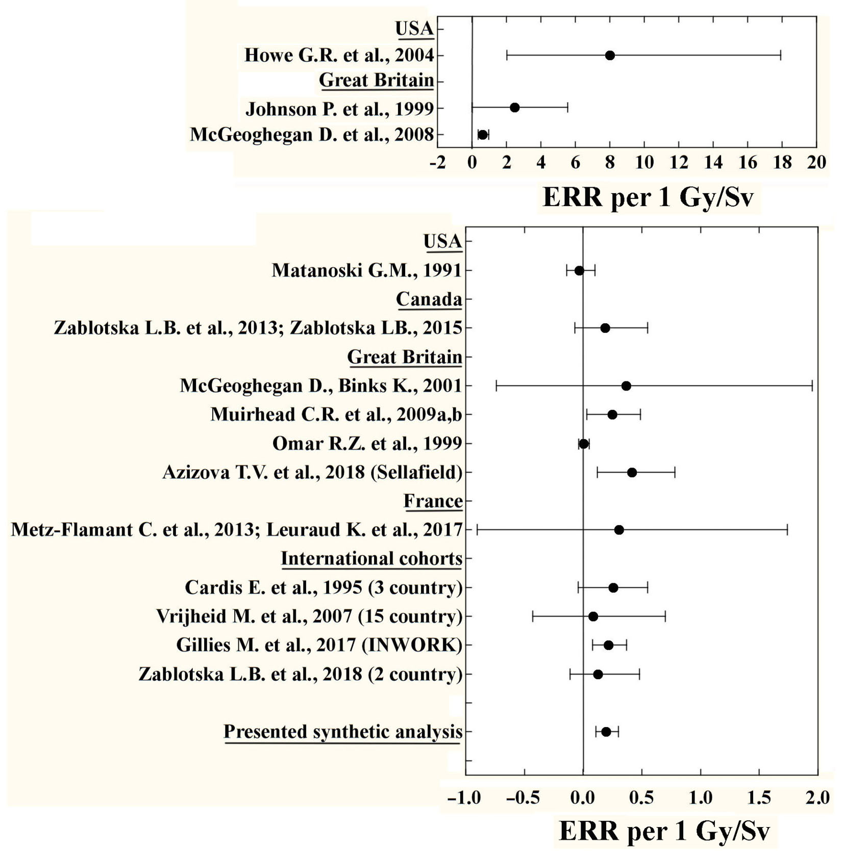 Из табл. 2 видно, что полученная нами только для работников ядерной индустрии средняя величина ERR на 1 Гр/Зв, а также результат соответствующего мета-анализа, в целом мало отличаются от данных мета-анализов M.P. Little с соавторами (2010–2016) [14, 16, 17, 20] (для столь разнородных выборок, как в этих работах, более адекватна именно Random effect model [54, 55]). Следует иметь в виду, что в 2010 г. M.P. Little был соавтором двух мета-анализов [14, 16], выполненных на практически одинаковых выборках (см. в Сообщении 1 [1]), но показавших величины ERR на 1 Гр/Зв, отличающиеся в два с лишним раза (см. табл. 2). Это, вероятно, является результатом порой произвольной комбинаторики источников для мета-анализов во всех таких работах [14, 16, 17, 20].