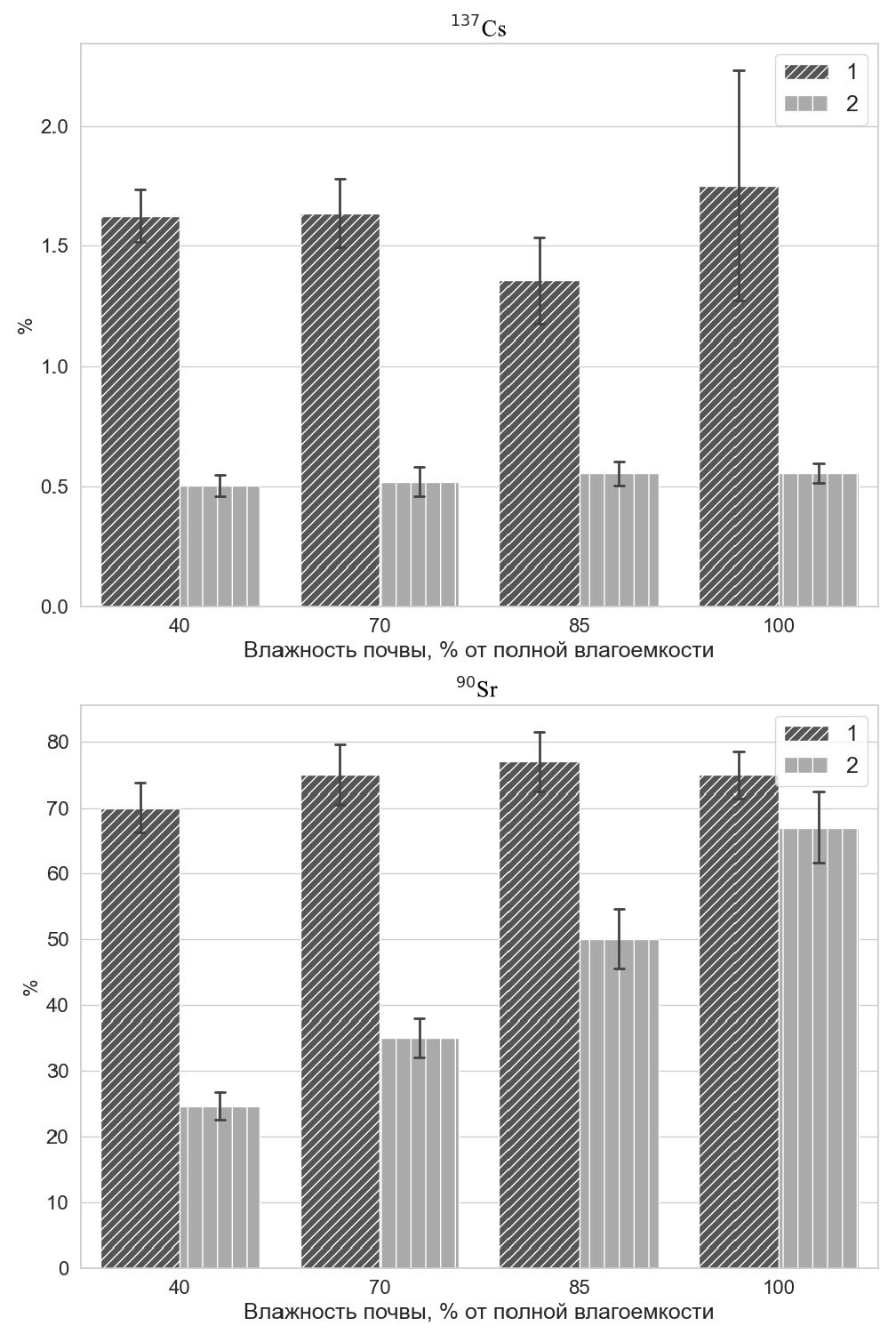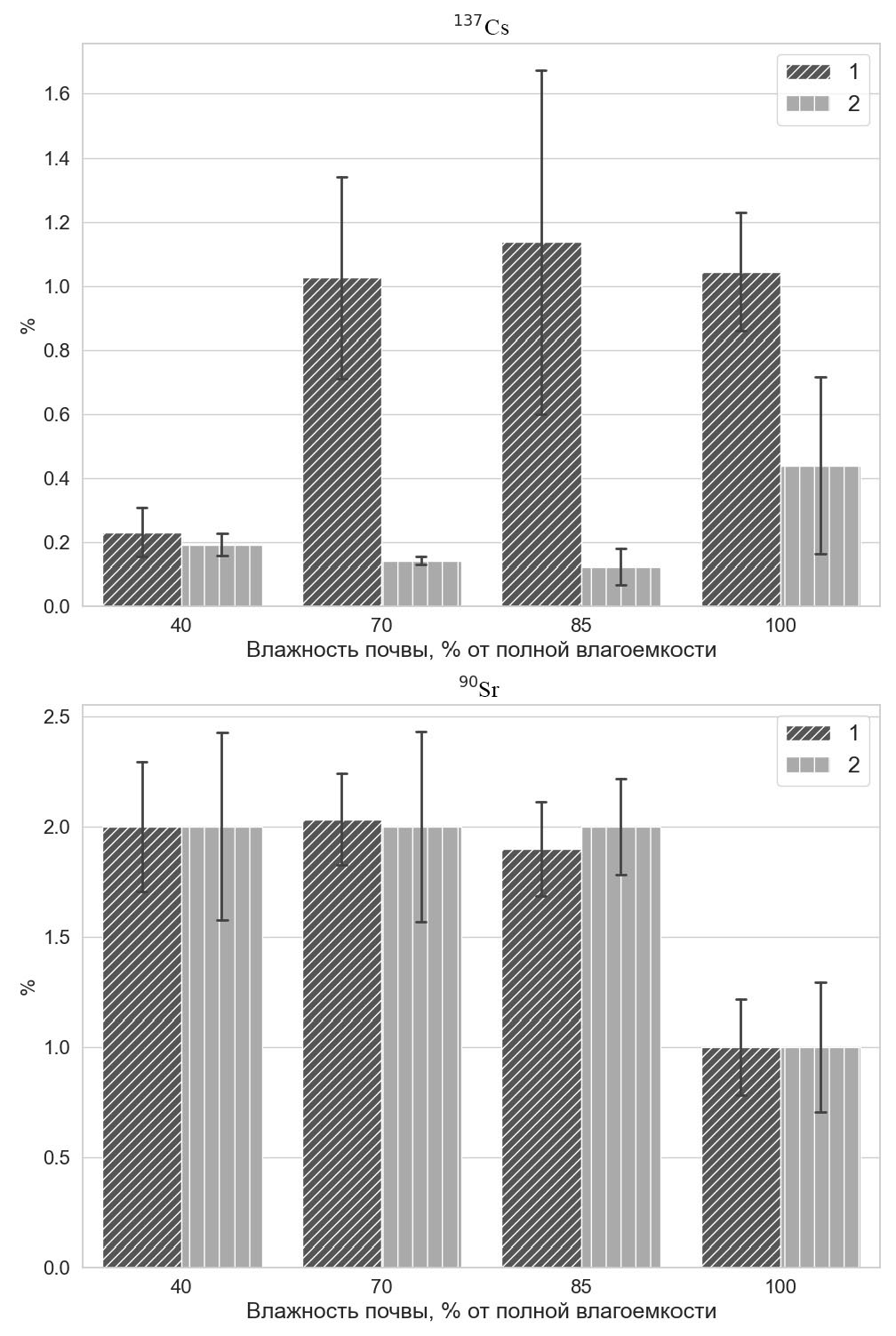 4. Fig. 3. Effect of soil moisture on the share of water-soluble ¹³⁷Cs and ⁹⁰Sr in sod-gleyed soil on sandy-loam alluvium (1) and sod-gley soil on sandy alluvium (2). Error bars are standard deviation.