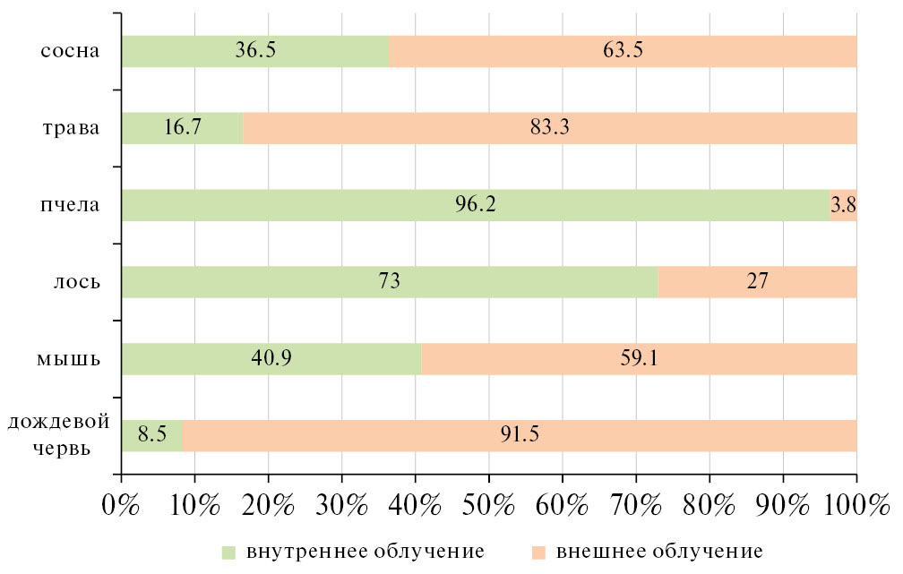 Соотношение внутреннего и внешнего облучения в суммарной поглощенной дозе от ¹³¹I различается для изученных видов биоты (рис. 3), но в большинстве случаев внешнее облучение вносит основной вклад (59–92%), за исключением пчелы и лося, у которых преобладало внутреннее облучение (73–96%).