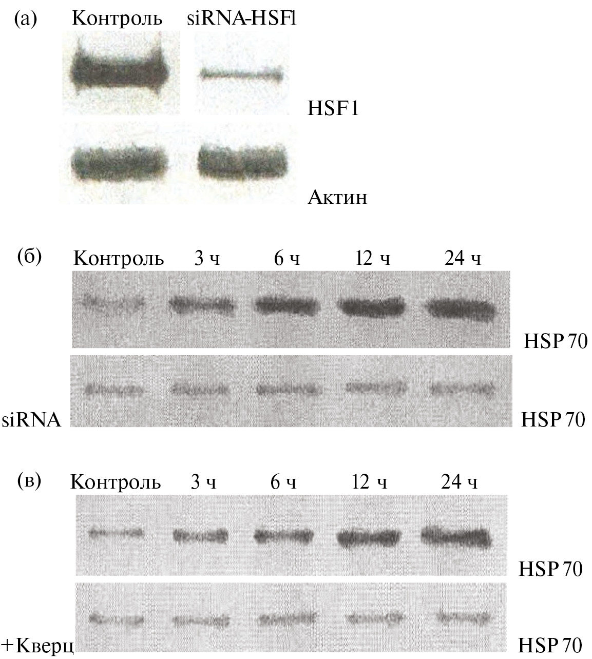 Рис. 1. Фрагменты блотов, показывающие как нокдаун HSF1 с помощью siRNA или ингибирование активности HSF1 кверцетином предотвращают накопление индуцибельной формы HSP70 в прогретых клетках HeLa: а – иммуноблоттинг с антителами к HSF1 для подтверждения подавления экспрессии HSF1 и с антителами к актину для контроля за равной нагрузкой; б – иммуноблоттинг с антителами к HSP70, детектирующий содержание HSP70 в клеточных лизатах, приготовленных на разных сроках после прогрева (43°C, 60 мин) клеток без нокдауна HSF1 (верхняя панель) или с нокдауном HSF1 (siRNA); в – иммуноблоттинг с антителами к HSP70, детектирующий содержание HSP70 в образцах клеток на разных сроках после прогрева (43°C, 60 мин) без ингибирования HSF1 (верхняя панель) или в присутствии 30 мкмоль/л кверцетина (+Кверц). Сроки после прогрева клеток указаны (в часах) по верхнему краю блотов.