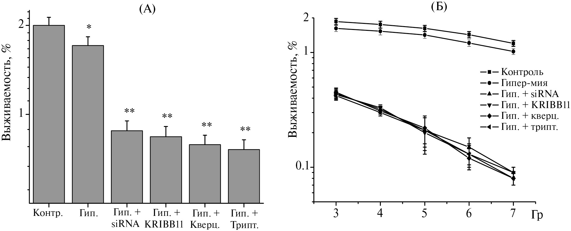 Выживаемость колоний необработанных клеток (Контр.) принималась за 100%. Перед облучением (3–7 Гр) клетки выдерживали в условиях гипертермии (Гип.: 43°C, 60 мин) без дополнительных обработок или после нокдауна HSF1 (siRNA), или в присутствии ингибиторов активности HSF1: 30 мкмоль/л кверцетина (Кверц), 10 нмоль/л триптолида (трипт) или 15 мкмоль/л KRIBB11.