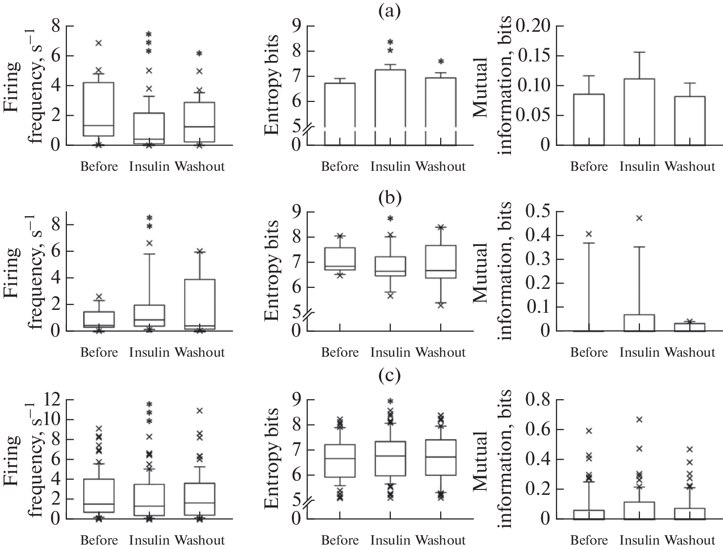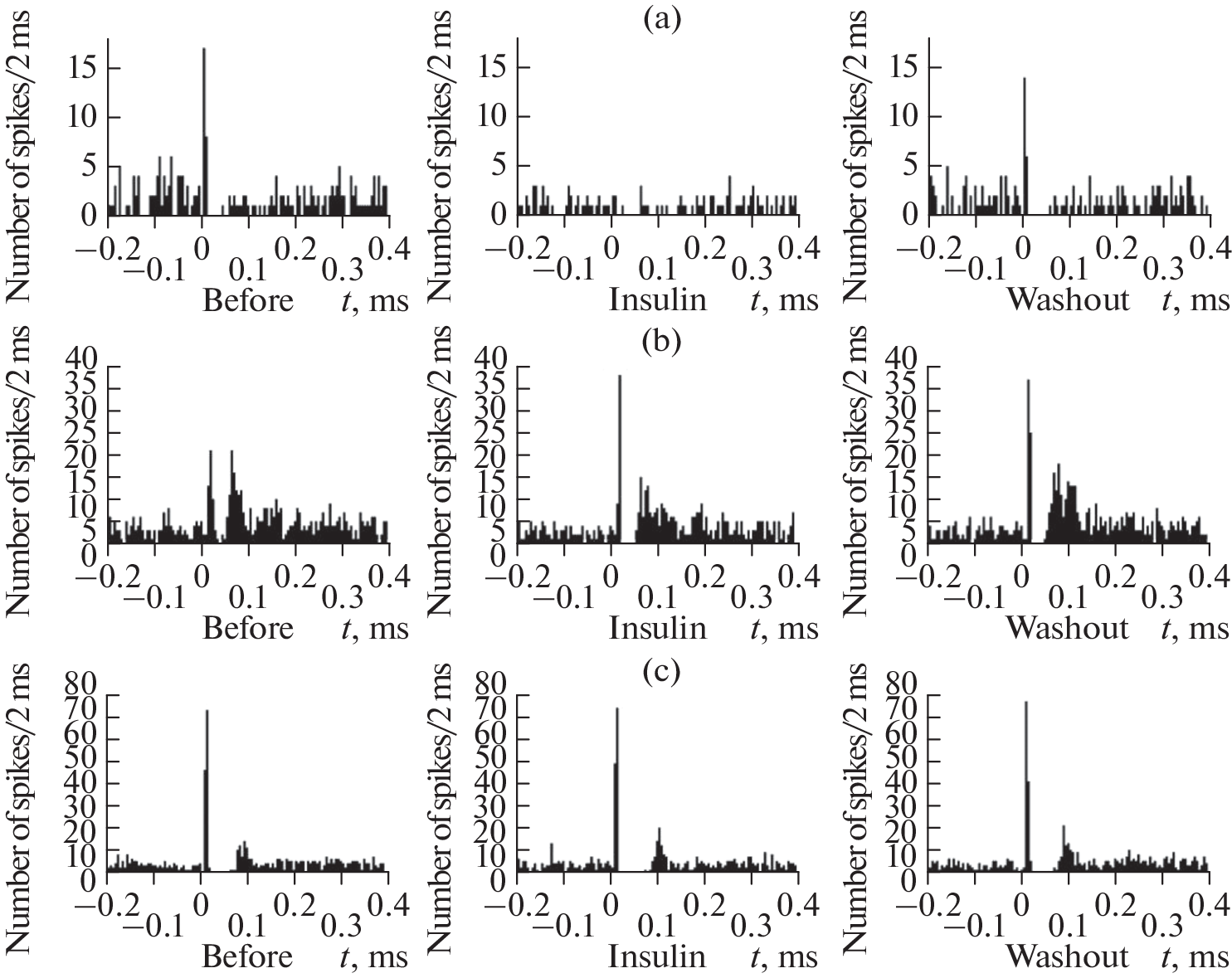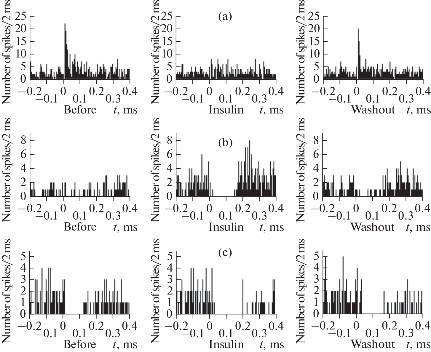 В экспериментах на сагиттальных срезах гипоталамуса крыс-самцов Вистар изучали влияние 15 нМ инсулина на уровень спайковой активности, параметры спайкового кодирования информации нейронами супрахиазматического ядра и функциональное состояние афферентных входов к этим нейронам из аркуатного ядра. Аппликации инсулина приводили к снижению частоты генерации потенциалов действия и росту энтропии распределения межспайковых интервалов у 33.3% зарегистрированных нейронов, у 12% клеток наблюдались реакции противоположной направленности, показатели спайковой активности остальных 54.7% нейронов не изменялись. Наблюдавшиеся реакции энтропии распределения межспайковых интервалов свидетельствуют о соответствующих изменениях степени нерегулярности межспайковых интервалов под влиянием инсулина. Характеристику афферентных входов к нейронам супрахиазматического ядра из аркуатного ядра производили с помощью электрофизиологической техники построения и анализа перистимульной временной гистограммы. Статистически значимые реакции на стимуляцию аркуатного ядра зарегистрированы у 24 из 38 протестированных нейронов супрахиазматического ядра. Из них у 6 нейронов реакция протекала в виде коротколатентного (<20 мс) возбуждения, у 1 нейрона – в виде длиннолатентного возбуждения, у 6 нейронов – в виде коротколатентного торможения, у 11 нейронов наблюдались комплексные двух- и трехфазные реакции в виде различных сочетаний возбуждения и торможения. Аппликации 15 нМ инсулина вызвали качественное изменение реакций (в виде исчезновения исходных или появления новых реакций) у 5 нейронов, первоначально отвечавших на стимуляцию, и у 1 нейрона, первоначально не отвечавшего на стимуляцию аркуатного ядра. Статистически значимых количественных изменений латентного периода и продолжительности реакций под влиянием инсулина не обнаружено. Полученные результаты указывают на способность инсулина оказывать влияние на уровень активности и спайковый код относительно многочисленной популяции нейронов циркадианного осциллятора супрахиазматического ядра, а также модулировать функциональное состояние афферентных входов к циркадианному осциллятору из гипоталамического аркуатного ядра, играющего важную роль в регуляции аппетита и метаболизма.