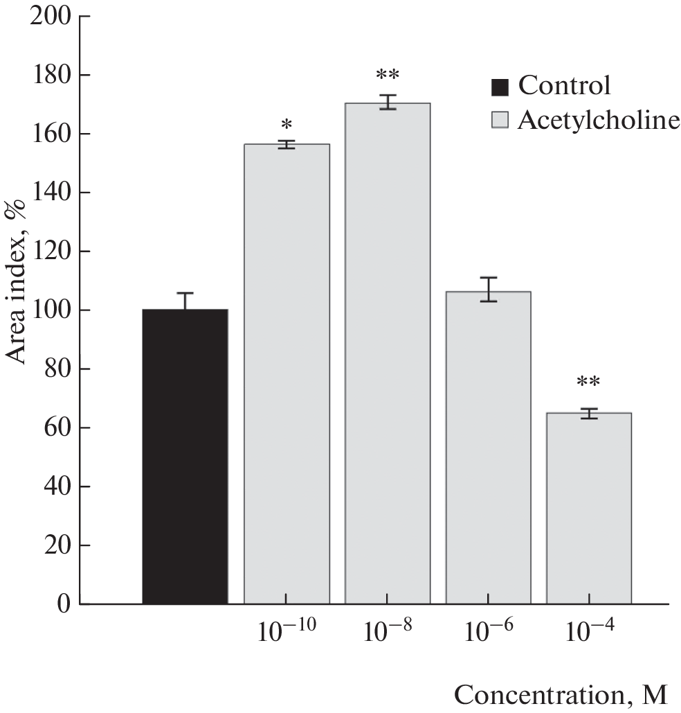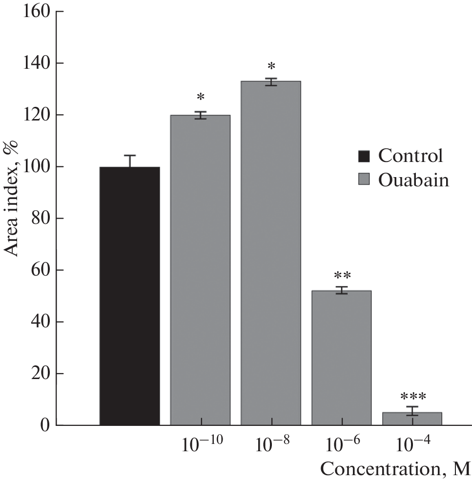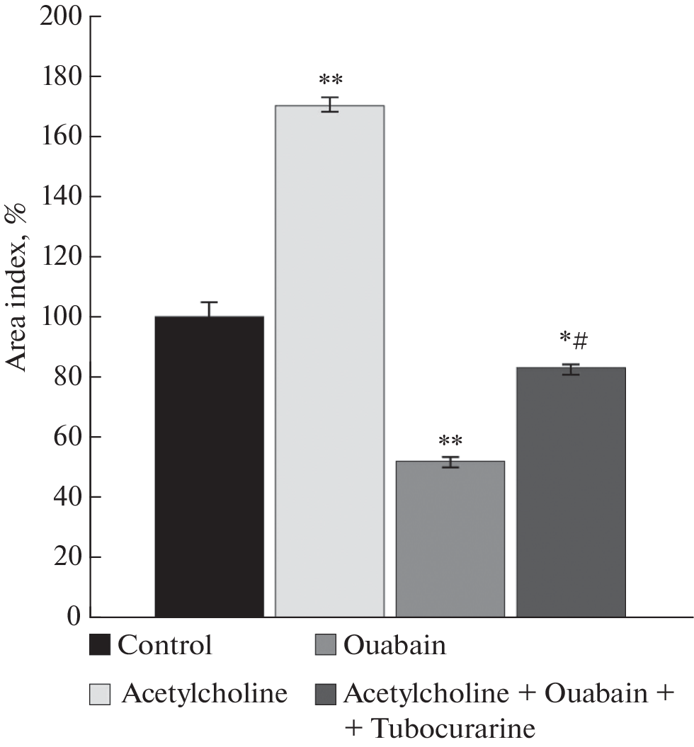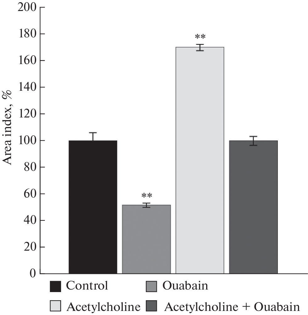 Recently, more and more attention has been paid to the discussion of the trophic function of the nervous system and its participation in the launch of signaling cascades regulating cellular metabolism. The role of acetylcholine and Na+,K+-ATPase in the regulation of skeletal muscle growth in 10–12-day-old chicken embryos under conditions of organotypic tissue culture was evaluated. The maximum trophotropic effect of acetylcholine was shown in a concentration 10–8 M. Inhibitory analysis proved the participation of the nicotinic acetylcholine receptor in this effect. Ouabain dose-dependent regulated the growth of skeletal muscle tissue explants. In concentrations comparable to endogenous ones, the glycoside stimulated the growth of experimental explants by 33% compared to the control value. The myotoxic properties of ouabain were found in the concentration range 10–6–10–4 M. Acetylcholine eliminated the myotoxic effect of the ouabain (10–6 M) both directly acting on the Na+,K+-ATPase, and the receptor-mediated through the nicotinic acetylcholine receptor.