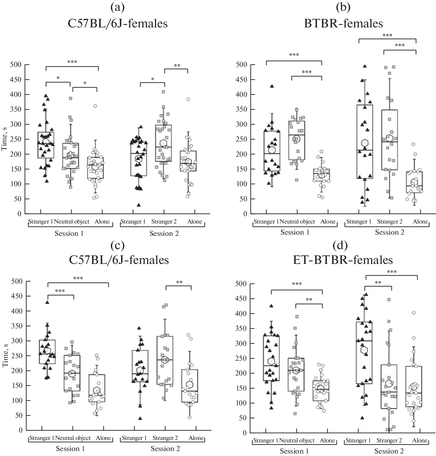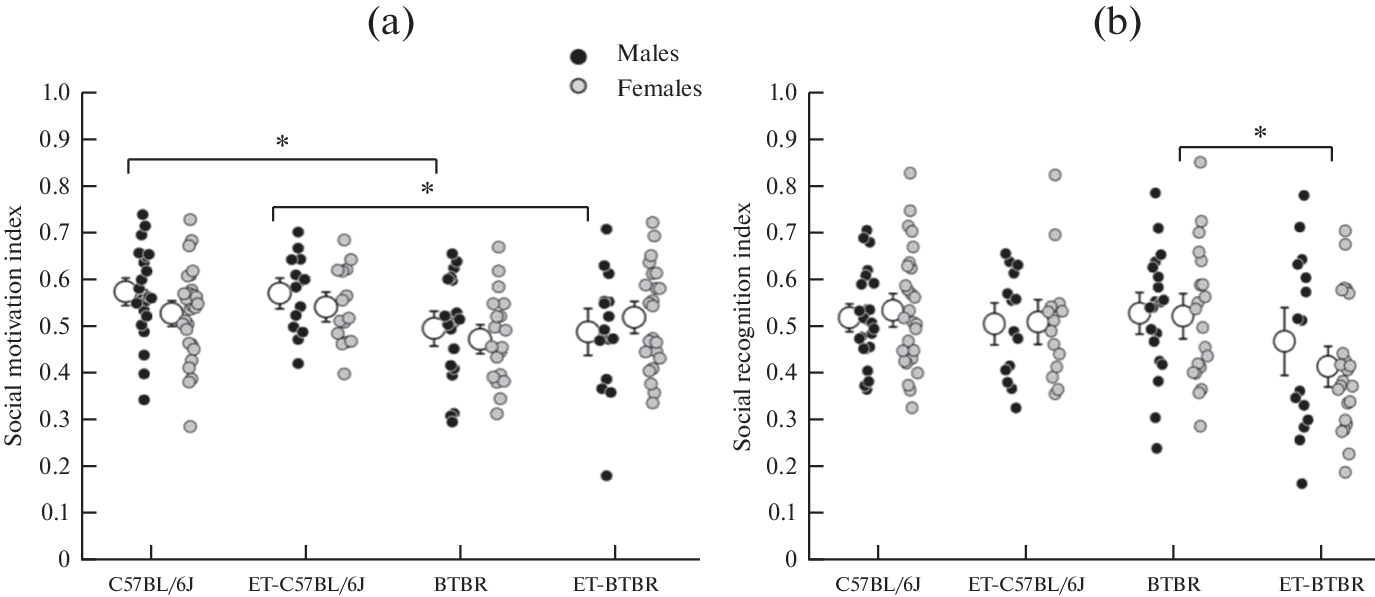 Работа является первым исследованием влияния такой вспомогательной репродуктивной технологии (ВРТ), как культивирование in vitro преимплантационных эмбрионов на социальное поведение потомков мышей линии BTBR (BTBR T + Itpr3tf/J), которая представляет собой идиопатическую модель аутизма. В качестве контроля были использованы мыши C57BL/6J. У взрослых потомков мышей, полученных в результате естественного спаривания (группы C57BL/6J и BTBR), либо после культивирования in vitro и переноса эмбрионов соответствующих линий мышей псевдобеременным самкам C57BL/6J (группы ВРТ-C57BL/6J и ВРТ-BTBR), было изучено социальное поведение. При межлинейном сравнении было показано, что мыши BTBR имеют сниженные уровни социального распознавания и мотивации по сравнению с мышами C57BL/6J. У самок ВРТ-C57BL/6J и ВРТ-BTBR было установлено снижение интереса к новому партнеру в сессии на социальное распознавание по сравнению с естественно зачатыми животными того же пола. Результаты поведенческого теста свидетельствуют о влиянии культивирования in vitro на социальное распознавание у потомков мышей линий C57BL/6J и BTBR, но только у самок.