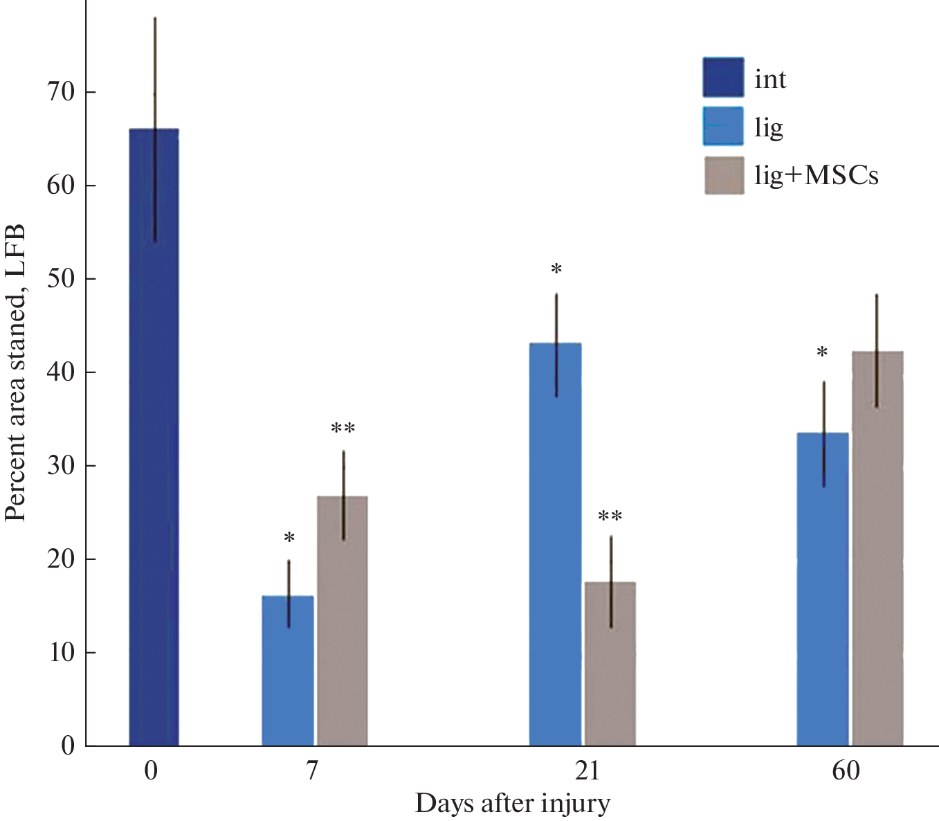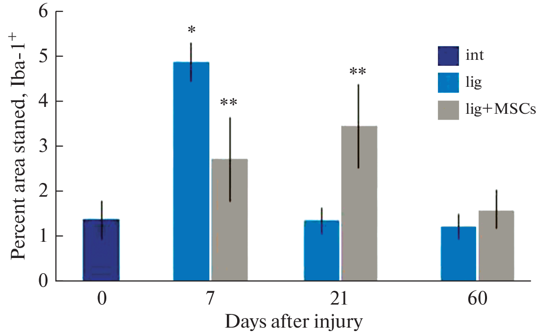 The dynamics of the processes of Wallerian degeneration in the Wistar-Kyoto rat sciatic nerve after injury (ligation, 40 s) was studied.The density of Iba-1+ macrophages and the state of myelin fibers stained with Luxol strong blue in the distal segment of the nerve at different times after injury were studied. Parts of rats were subperineurally transplanted with MSCs from the bone marrow of Wistar-Kyoto rats. It was shown that the highest distribution density of macrophages in the distal segment of the nerve was observed 7 days after surgery. The use of cell therapy leads to a decrease in the number of macrophages during this period and to a delay in the demyelination of damaged nerve fibers. Sixty days after the operation, the macrophage population density and the number of remyelinated regenerating nerve fibers of the distal nerve segment did not differ in control (ligature) and experimental (ligature and MSC injection) animals. The molecular mechanisms of the noted changes in the early stages after injury require further research.