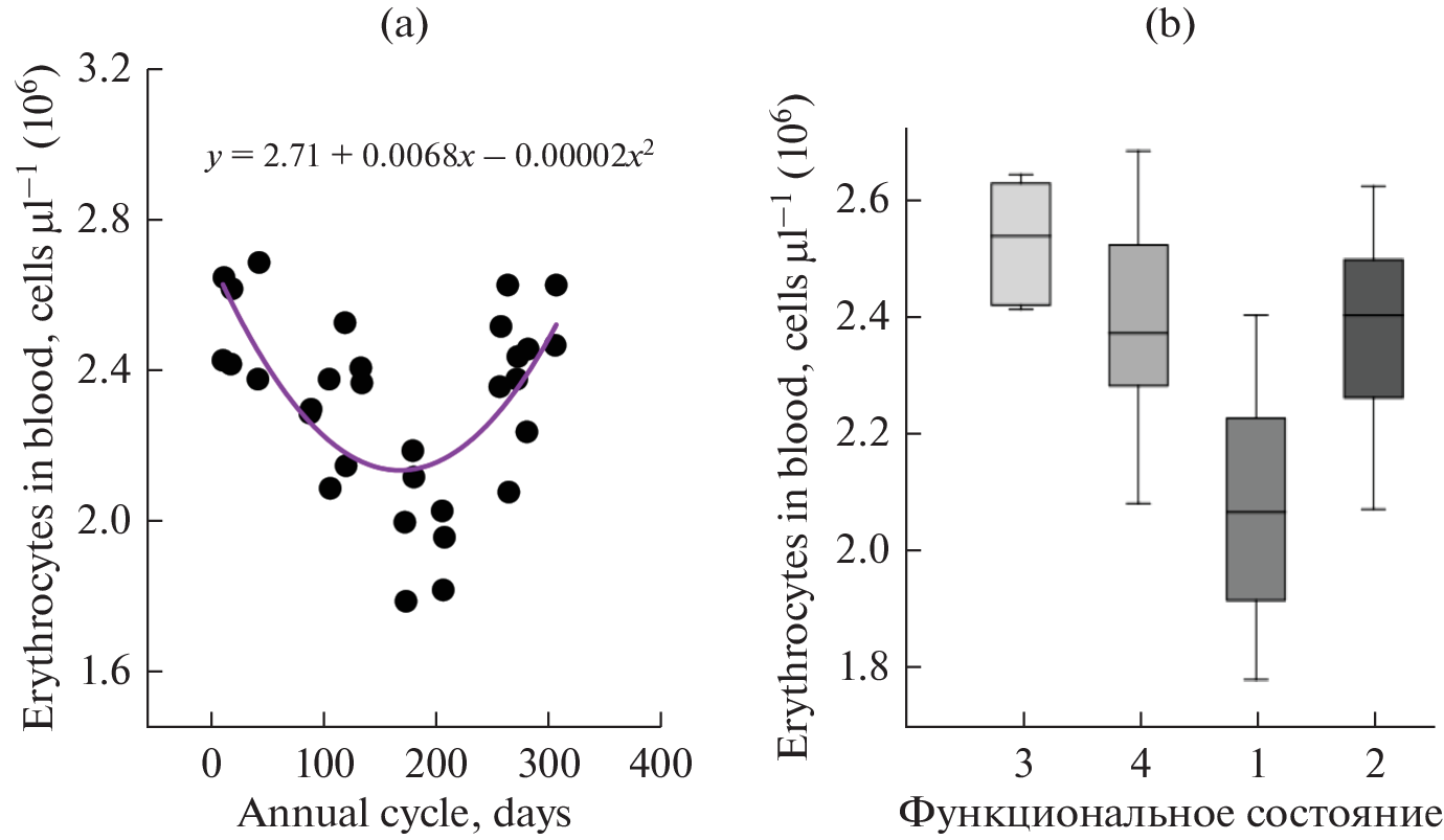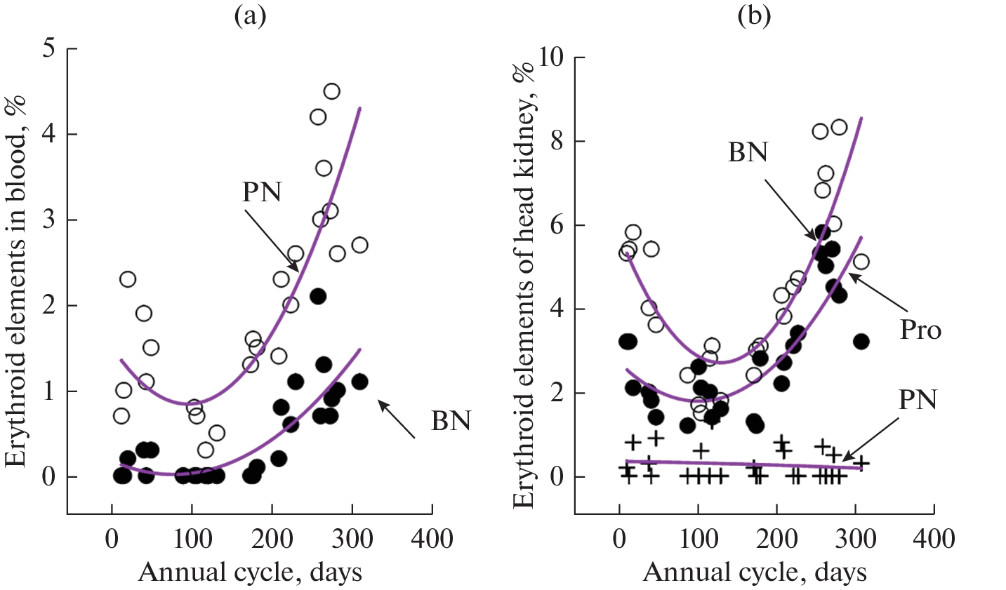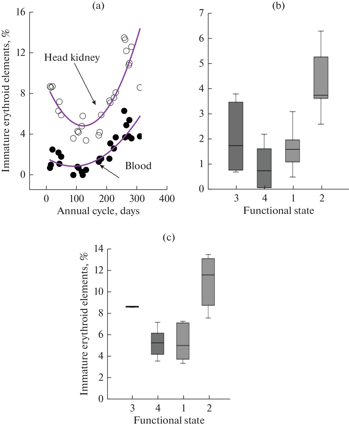 The changes in the number of erythrocytes in the blood and the production of erythrocytes by the hematopoietic tissue of the golden grey mullet (Chelon auratus Risso, 1810) during the annual cycle were studied. Catching and delivery of fish to the aquarium was carried out monthly. The content of immature erythroid forms was determined: erythroblasts, basophilic and polychromatophilic normoblasts, in the head kidney (pronephros) and circulating blood. It has been established that the processes of erythropoiesis in the hematopoietic tissue of the golden grey mullet proceed irregularly. The active production of erythroid mass is mainly confined to the post-spawning period. This is evidenced by an increase in the content of immature erythroid forms in the head kidney and blood. This coincides with a general increase in the number of red blood cells in the circulation system and indicates a shift in the erythrocyte balance in favor of production processes. In the rest of the time, the processes are opposite. It is assumed that this is due to the peculiarities of the organization of the red blood system, which excludes the regular production of erythropoietin in the kidneys.