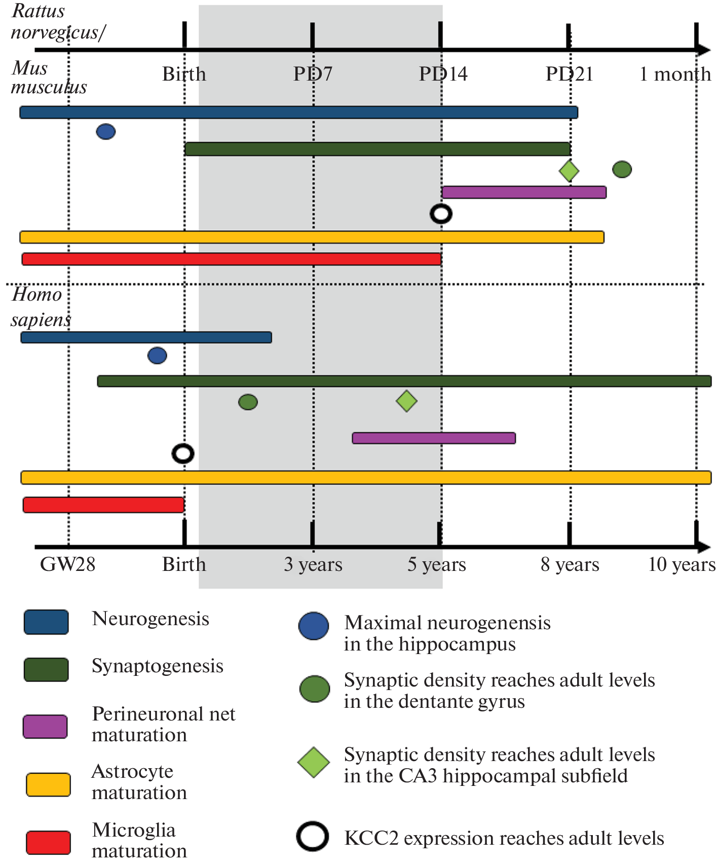 В настоящее время не вызывает сомнений, что целый ряд заболеваний психоневрологического спектра ассоциированы со стрессом в детском возрасте. Для изучения механизмов раннего стресса используют различные модели на лабораторных грызунах, позволяющие получить данные о механизмах патогенеза психопатологий, которые невозможно исследовать на людях. Для успешной трансляции данных необходимо, в частности, сравнение процессов нейроонтогенеза в момент предъявления воздействия и последующие периоды. В литературе немало сравнительных исследований, касающихся развития нейронов и нейрональных сетей, а также изменений гипоталамо-гипофизарно-надпочечниковой оси. В последние годы достоверно показано, что важным участником как развития мозга, так и его реакции на стресс являются глиальные клетки. Подкрепляется мнение о том, что именно микроглия и астроциты представляют наиболее перспективные мишени для терапевтического воздействия при стресс-зависимых заболеваниях. Тем не менее, до сих пор отсутствуют сравнительные аналитические исследования, охватывающие как стресс-реализующие системы, так и нейрональные и глиальные маркеры развития. Данный обзор, заполняющий этот пробел, может дать новый ракурс для рассмотрения проблем моделирования детского стресса и трансляции полученных данных. Представленный анализ суммирован в сравнительной схеме основных событий нейроонтогенеза лабораторных грызунов и человека в гипочувствительный к стрессу период, эта схема дополняет существующее представление о соответствии этапов развития мозга у лабораторных грызунов и человека. Представленные данные позволяют наметить точки роста и ставят новые вопросы перед исследователями стресса в раннем онтогенезе.