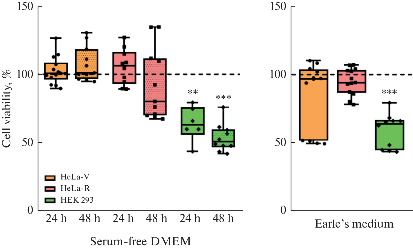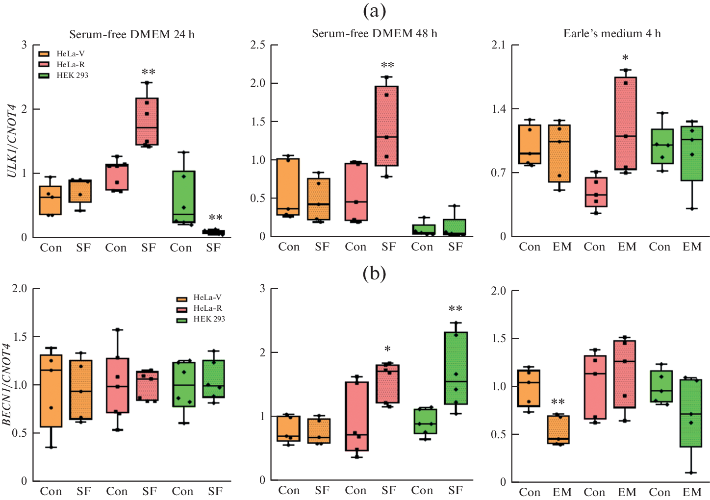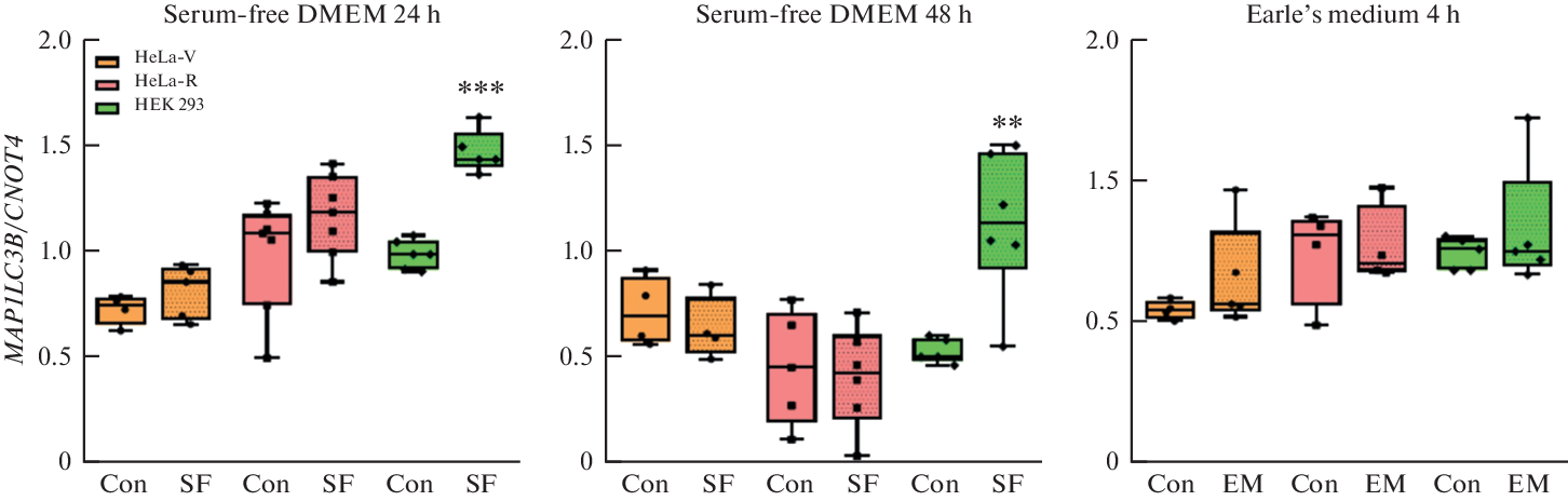 The goal of the study was a comparing the degree of development of autophagy in the human cervical carcinoma cells of HeLa-V and HeLa-R sublines and non-tumor human embryonic kidney cells HEK 293 under two types of starvation conditions – 24- and 48-h culture in serum-free DMEM medium and 4-h incubation in Earle’s minimal medium. The work assessed cell viability using MTT method and the expression of apoptosis (BCL2, BAX, CASP3) and autophagy (ULK1, BECN1, ATG5, ATG14, MAP1LC3B) genes using real-time PCR. Cultivation under serum starvation and Earl’s medium resulted in a significant decrease in the viability of HEK 293 cells, but had no influence on HeLa-V and HeLa-R cells. In the tumor cells of both lines, the expression of anti-apoptotic gene BCL2 increased, while in HEK 293 cells the BCL2/BAX ratio decreased and CASP3 gene was activated. In HeLa-V and HeLa-R cells, nutrient deprivation induced the stimulation of various combinations of genes ULK1, BECN1, ATG5 and ATG14 implicated in the initial stages of autophagy, but none of the treatments affected the expression of MAP1LC3B gene. In HEK 293 cells, serum starvation led to increase in expression level of BECN1, ATG5, ATG14 and MAP1LC3B genes. Thus, stimulation of autophagy in HeLa cells, especially HeLa-R, prevents the development of apoptotic processes, while in HEK 293 cells the processes of apoptosis and autophagy occur in parallel. Culture in the serum-free DMEM for 48 h appears to be most effective way to induce autophagy in tumor cell lines and, accordingly, the most suitable model for studying the role of autophagy in the development of their resistance to apoptotic pathway of death.