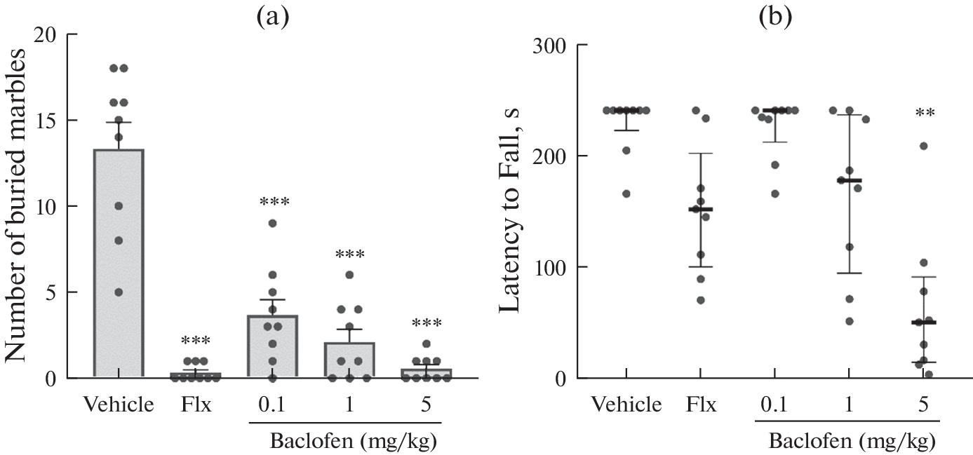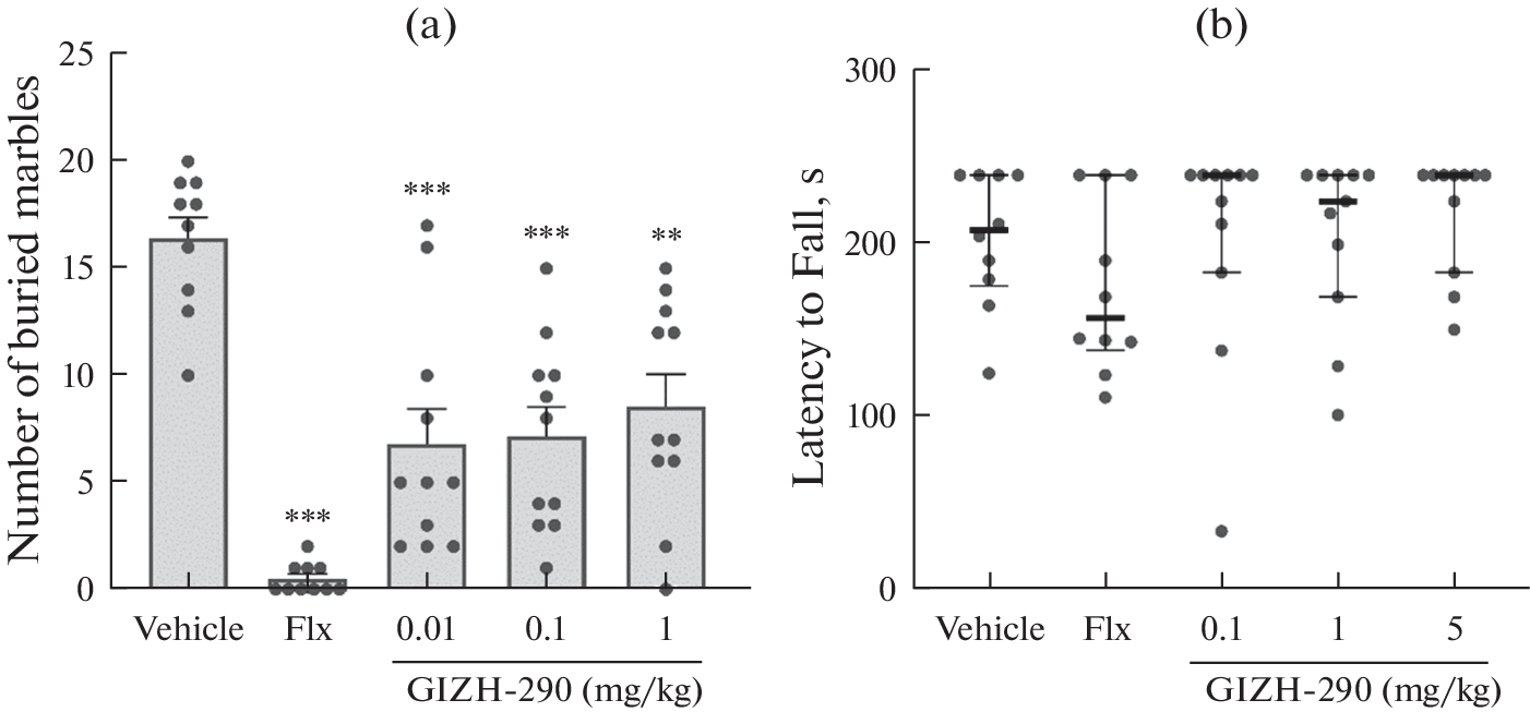Obsessive-compulsive disorder (OCD) is a mental disease characterized by the obsessions which cause marked distress or anxiety and/or compulsions intended to alleviate this distress. The results of experimental and clinical studies suggest a possible role of GABAB receptors in the pathogenesis of OCD, making it relevant to study the effect of ligands of these receptors on the behavior of rodents. Objectives: Studying the effects of GIZH-290 and baclofen in animal models of OCD. Methods. The effects of GIZH-290 (0.01, 0.1, 1 mg/kg, i.p.) and baclofen (0.1, 1, and 5 mg/kg, i.p.) were studied in the marble burying test and the rotarod test, as well as in the 8-OH-DPAT-induced decrease in spontaneous alternation in mice. Results. Baclofen and GIZH-290 attenuated compulsive-like behavior in mice by reducing the number of buried marbles in the marble burying test at all tested doses. However, the effect of baclofen at a dose of 5 mg/kg was accompanied by a disruption of the animals’ motor coordination in the rotarod test. At the same time, neither baclofen nor GIZH-290 attenuated 8-OH-DPAT-induced (2 mg/kg, i.p.) decrease in spontaneous alternation behavior in mice. On the contrary, baclofen at a dose of 1 mg/kg exacerbated this disruption. Conclusion. Baclofen and GIZH-290 have anticompulsive activity in the marble burying test, but not in the 8-OH-DPAT-induced decrease in spontaneous alternation behavior in mice.