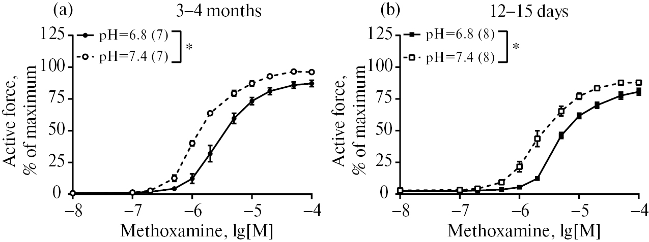 Рис. 1. Влияние внеклеточного ацидоза (рН 6.8) на сократительные ответы подкожной артерии на метоксамин у крыс в возрасте 3–4 месяцев (a) и 12–15 дней (b). Числа в скобках обозначают количество животных в группе. * p < 0.05 (двухфакторный дисперсионный анализ для повторных измерений).