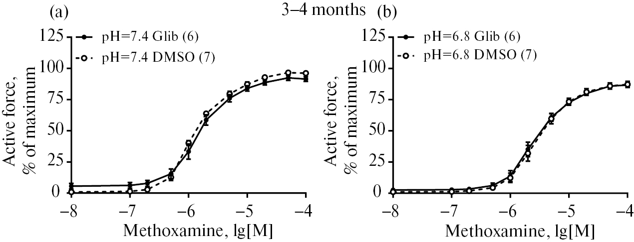 Рис. 2. Влияние блокатора KATP-каналов глибенкламида на сократительные ответы подкожной артерии на метоксамин у крыс в возрасте 3–4 месяцев при рН 7.4 (а) и рН 6.8 (b). Числа в скобках обозначают количество животных в группе.