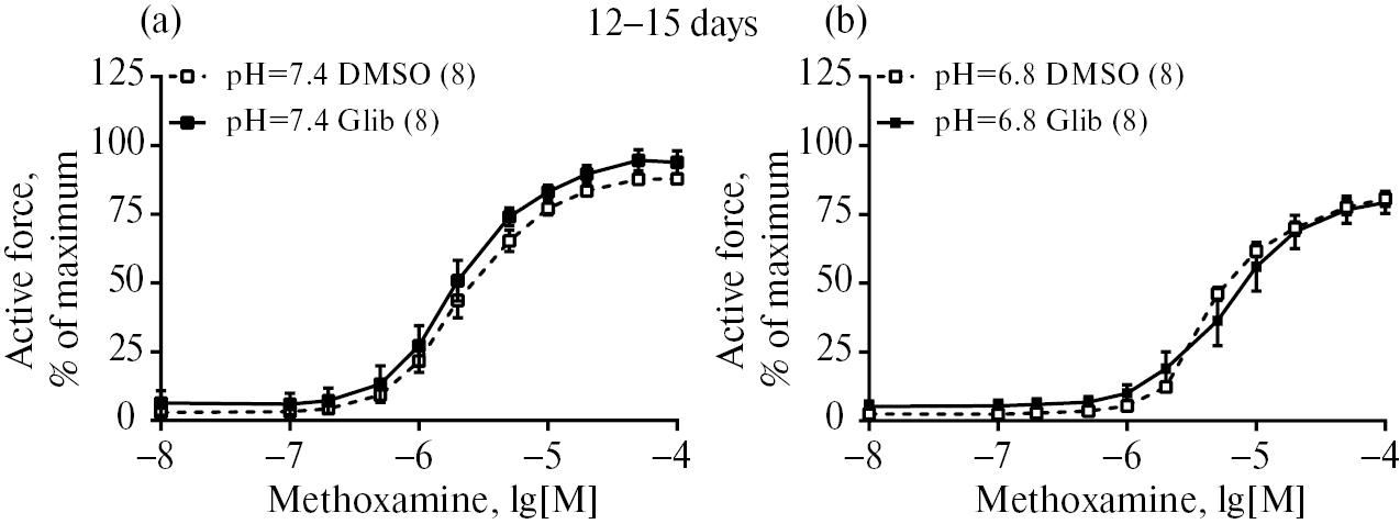 Рис. 3. Влияние блокатора KATP-каналов глибенкламида на сократительные ответы подкожной артерии на метоксамин у 12–15-дневных крысят при рН 7.4 (а) и рН 6.8 (b). Числа в скобках обозначают количество животных в группе.