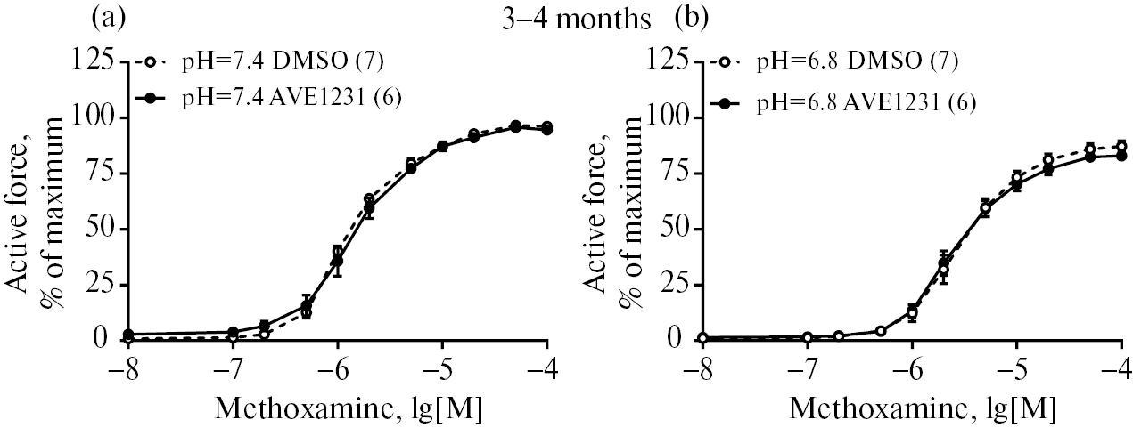 У 12–15-дневных крысят AVE1231 приводил к существенному усилению сократительных ответов артерий на метоксамин при рН 7.4 (рис. 5а). При рН 6.8 AVE1231 также вызывал прирост сократительных ответов на метоксамин (рис. 5b), который, однако, был меньше, чем при нормальном рН. Для того, чтобы сравнить эффекты AVE1231 при рН 7.4 и при рН 6.8, мы оценивали изменение площади под кривыми в присутствии AVE1231 в процентах от площади в присутствии растворителя при каждом рН. Оказалось, что при рН 7.4 площадь в присутствии AVE1231 составила 164 ± 10% от площади в присутствии ДМСО, а при рН 6.8 площадь в присутствии AVE1231 составила 128 ± ± 12% от площади в присутствии ДМСО (p < 0.05, непарный t-критерий Стьюдента). Следовательно, мы можем сделать вывод, что при более кислом рН влияние AVE1231 на сократительные ответы артерий на метоксамин у 12–15-дневных крысят оказываются меньше, чем при нормальном рН.
