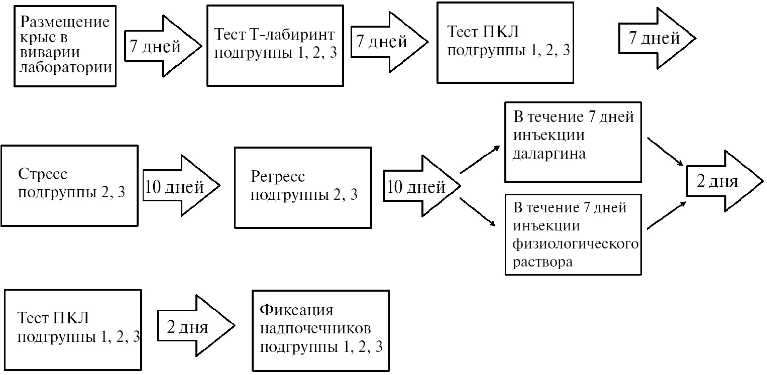 Каждая группа была разделена на три подгруппы: подгруппа 1 – контроль (крысы, не подвергавшиеся стрессорным и фармакологическим воздействиям), подгруппа 2 – модель ПТСР + инъекции физиологического раствора, подгруппа 3 – модель ПТСР + + инъекции даларгина.