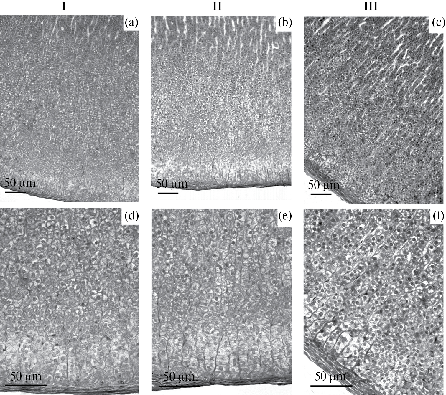 Рис. 8. Кора надпочечников крыс группы ПВТ, окраска железным гематоксилином по методу Гейденгайна. I (a, d) – подгруппа 1 (контроль); II (b, e) – подгруппа 2 (модель ПТСР + инъекции физиологического раствора); III (c, f) – подгруппа 3 (модель ПТСР + инъекции даларгина); (a, b) – ув. 20; (c, d, e) – ув. 40; (f) – ув. 100.