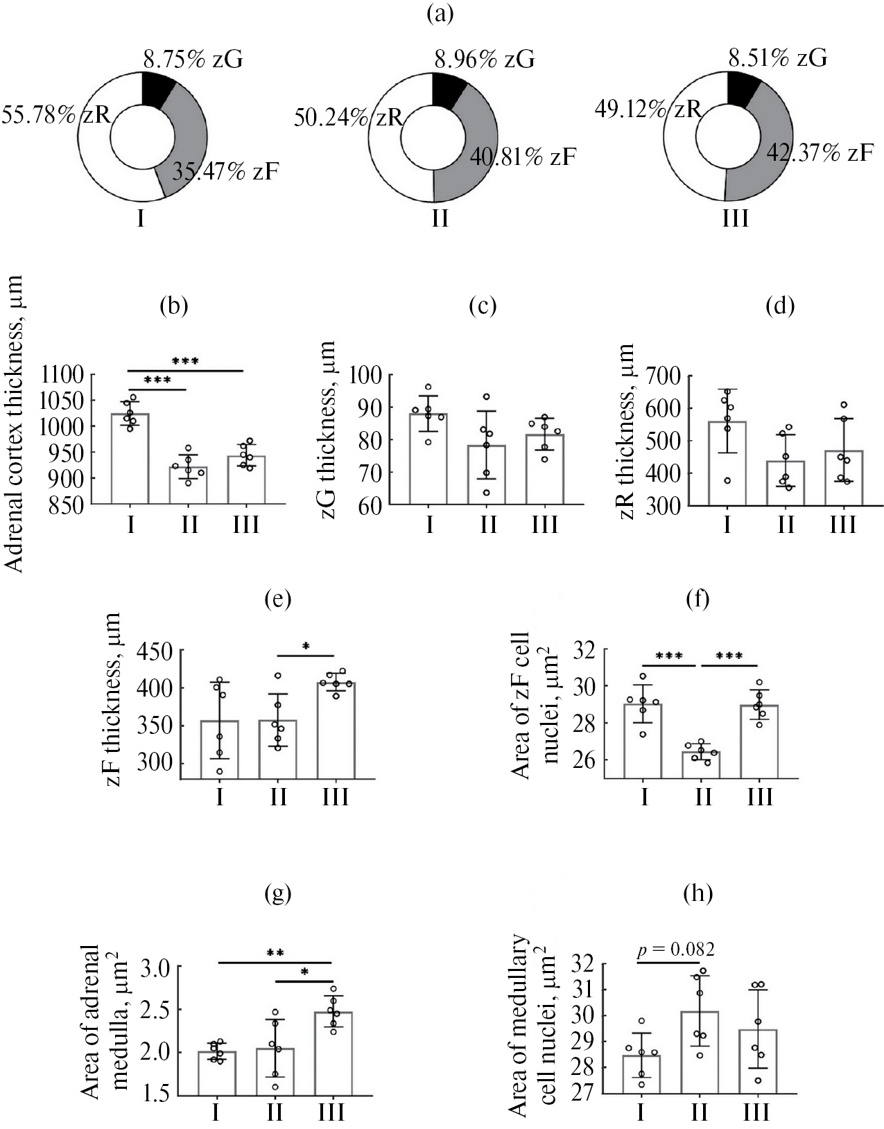 Рис. 3. Морфометрические показатели надпочечников крыс группы АНТ; (a) – процентное соотношение клубочковой (zG), пучковой (zF) и сетчатой (zR) зон в коре надпочечников; на графиках (b, c, d, e, f, g, h) – морфометрические изменения коры и мозгового вещества надпочечников, результаты представлены в виде M ± SD и приведены индивидуальные значения для каждого животного. I – подгруппа 1, контроль; II – подгруппа 2, модель ПТСР + инъекции физиологического раствора; III – подгруппа 3, модель ПТСР + инъекции даларгина; * p < 0.05, ** р < 0.01, *** p < 0.001 – достоверные отличия между подгруппами в ANOVA с апостериорным критерием Тьюки или ANOVA с поправкой Уэлча и апостериорным критерием Геймс-Хоуэла, 0.05 ≤ p ≤ 0.1 (p = 0.082) – тенденция различий между подгруппами в ANOVA с апостериорным критерием Тьюки; (b) – толщина коры надпочечников, F(₂,₁₅)= 35.63, p < 0.001, по оси ординат – thickness adrenal cortex, μm (толщина коры надпочечников, мкм); (c) – толщина клубочковой зоны, F(₂,₁₅)= 2.68, p = 0.101, по оси ординат – thickness zG, μm (толщина клубочковой зоны, мкм); (d) – толщина сетчатой зоны, F(₂,₁₅)= 2.8, p = 0.09, по оси ординат – thickness zR, μm (толщина сетчатой зоны, мкм); (e) – толщина пучковой зоны, F(₂,₇.₆₂)= 7.38, p = 0.017, по оси ординат – thickness zF, μm (толщина пучковой зоны, мкм); (f) – площадь ядра в клетках пучковой зоны, F(₂,₁₅)= 21.43; p < 0.001, по оси ординат – the area of the nucleus, μm² (площадь ядра, мкм²); (g) – площадь мозгового вещества, F(₂,₁₅)= 7.82, p = 0.005, по оси ординат – the area of the adrenal medulla, mm² (площадь мозгового вещества, мм²); (h) – площадь ядра в клетках мозгового вещества, F(₂,₁₅)= 2.73, p = 0.096. по оси ординат – the area of the nucleus, μm² (площадь ядра, мкм²).