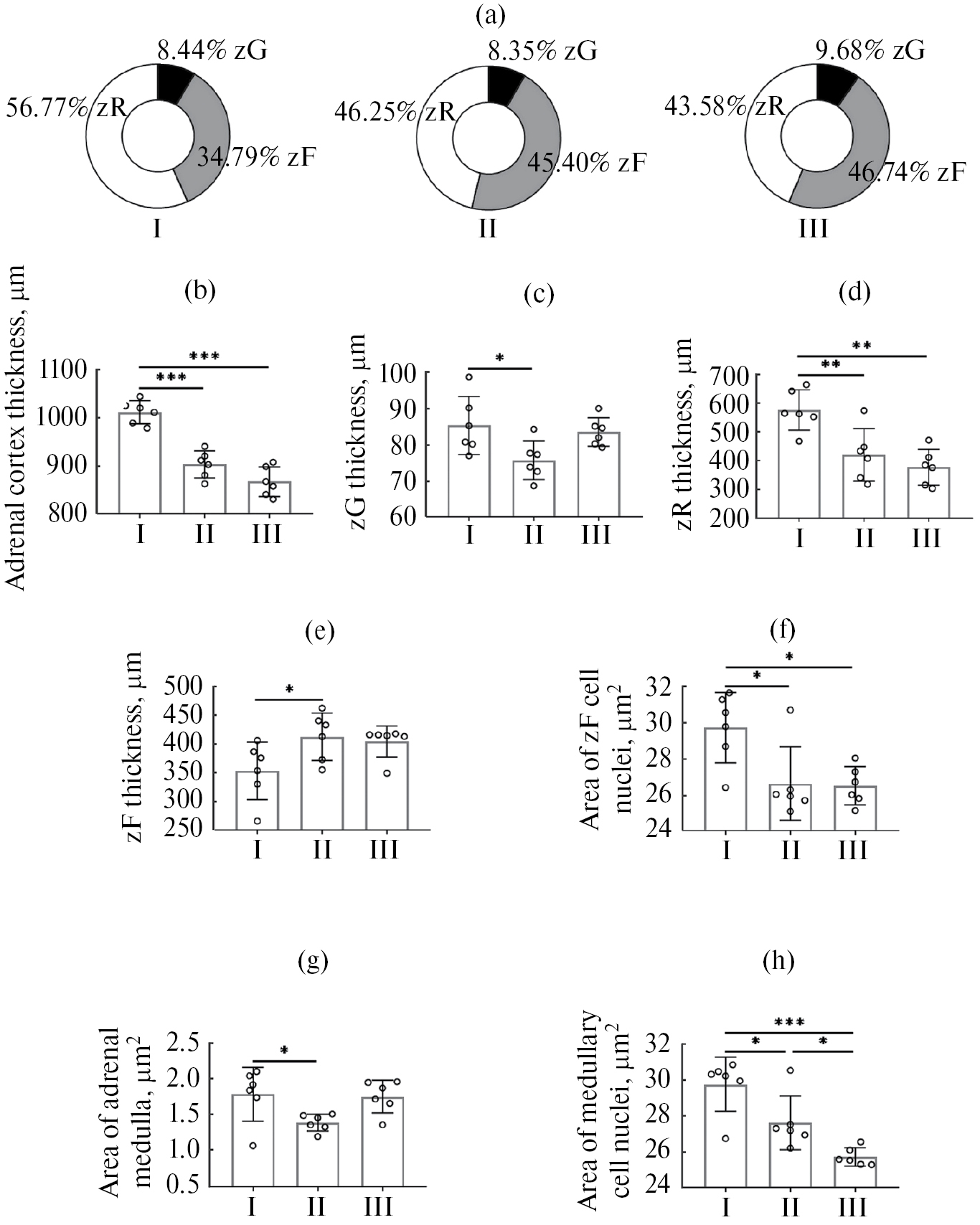 Рис. 7. Морфометрические показатели надпочечников крыс группы ПНТ; (a) – процентное соотношение клубочковой (zG), пучковой (zF) и сетчатой (zR) зон в коре надпочечников; на графиках (b, c, d, e, f, g, h) – морфометрические изменения коры и мозгового вещества надпочечников, результаты представлены в виде M ± SD и приведены индивидуальные значения для каждого животного. I – подгруппа 1, контроль; II – подгруппа 2, модель ПТСР + инъекции физиологического раствора; III – подгруппа 3, модель ПТСР + инъекции даларгина; * p < 0.05, ** р < 0.01, *** p < 0.001 – достоверные отличия между подгруппами в ANOVA с апостериорным критерием Тьюки; (b) – толщина коры надпочечников, F(₂,₁₅)= 43.9, p < 0.001, по оси ординат – thickness adrenal cortex, μm (толщина коры надпочечников, мкм); (c) – толщина клубочковой зоны, F(₂,₁₅)= 4.34, p = 0.032, по оси ординат – thickness zG, μm (толщина клубочковой зоны, мкм); (d) – толщина сетчатой зоны, F(₂,₁₅)= 11.46, p < 0.001, по оси ординат – thickness zR, μm (толщина сетчатой зоны, мкм); (e) – толщина пучковой зоны, F(2,15 )= 4.78, p = 0.041, по оси ординат – thickness zF, μm (толщина пучковой зоны, мкм); (f) – площадь ядра в клетках пучковой зоны, F(₂,₁₅)= 6.65, p = 0.008, по оси ординат – the area of the nucleus, μm² (площадь ядра, мкм²); (g) – площадь мозгового вещества, F(₂,₁₅)= 4.18, p = 0.036, по оси ординат – the area of the adrenal medulla, mm² (площадь мозгового вещества, мм²); (h) – площадь ядра в клетках мозгового вещества, F(₂,₁₅)= 15.34, p < 0.001, по оси ординат – the area of the nucleus, μm² (площадь ядра, мкм²).