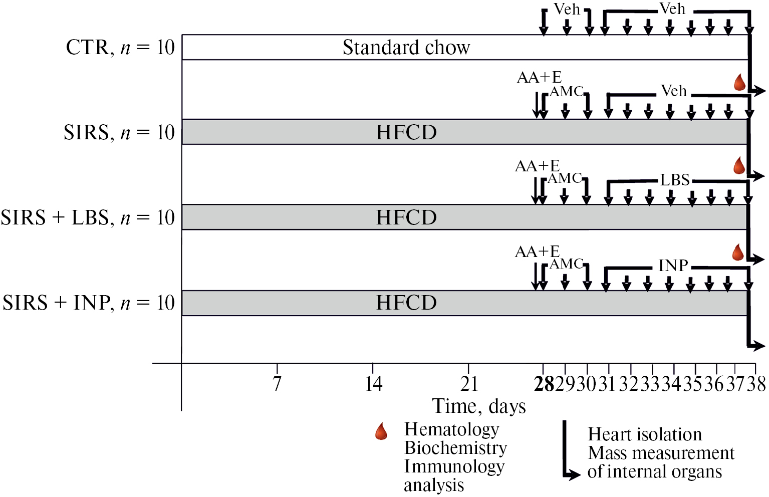 Рис. 1. Дизайн эксперимента. CTR – контроль; SIRS (CCВО) – синдром системного воспалительного ответа; SIRS + LBS – ССВО и смесь LA-5 и BB-12; SIRS + INP – ССВО и инактивированный пробиотик. AA + E – смесь 3%-ного раствора уксусной кислоты и 3%-ного этанола. AMC – смесь антимикробных препаратов, HFCD – диета с повышенным содержанием жиров и углеводов, Veh – физиологический раствор. Детали эксперимента подробно описаны в тексте.