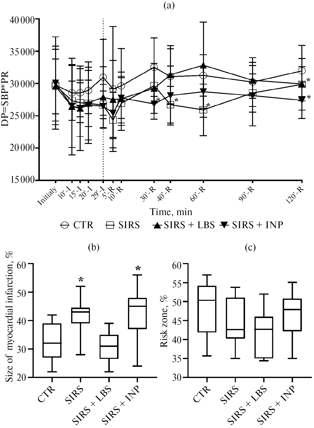 Рис. 2. Двойное произведение ЧСС и АД (а), Mean ± SD, размер инфаркта миокарда (b) и размер зоны риска (c), %, Me [25%; 75%]. * – р < 0.05 по отношению к группе КТР. КТР – контроль; ССВО – синдром системного воспалительного ответа; ССВО + ЛБС – ССВО и смесь LA-5 и BB-12; ССВО + ИНП – ССВО и инактивированный пробиотик.