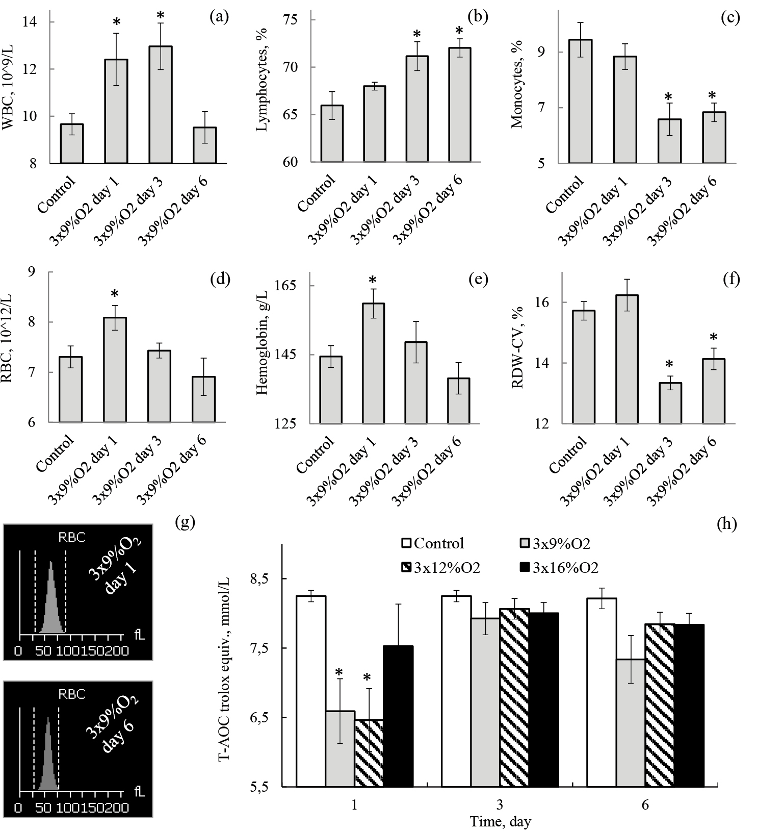 Рис. 2. Динамика изменений клеточной формулы крови на 1-е, 3-и и 6-е сутки после ИГТ в режиме 3 × 9% O₂ (a-g) и общей антиоксидантной способности сыворотки после ИГТ при 9, 12 и 16% кислорода (f). (a) ‒ общее количество лейкоцитов (WBC), 10⁹ клеток/л. (b) ‒ доля лимфоцитов от общего числа лейкоцитов, %. (c) ‒ относительное процентное содержание моноцитов, %. (d) ‒ количество эритроцитов (RBC), 10¹²/л. (e) ‒ концентрация гемоглобина, г/л. (f) ‒ коэффициент вариации ширины распределения эритроцитов (RDW-CV), %. (g) ‒ гистограммы распределения эритроцитов, фл. (h) ‒ общая антиоксидантная способность (T-AOC) сыворотки крови в тролоксовом эквиваленте, ммоль/л. Обозначения: Белые столбики ‒ Control, контрольная группа, не проходившая ИГТ; серые ‒ 3 × 9% O₂, группа ИГТ при уровне кислорода 9%; штрихованные ‒ 3 × 12% O₂, крысы, тренировавшиеся при оксигенации 12%; черные ‒ 3 × 16% O₂, содержание кислорода в смеси для ИГТ животных составляло 16%.