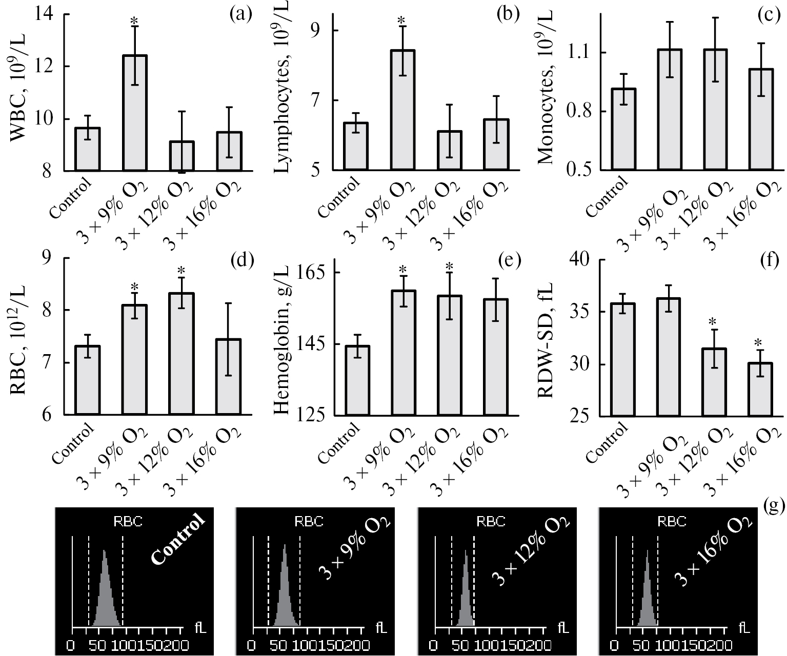 Рис. 1. Влияние ИГТ в различных режимах на показатели общего анализа крови крыс через 24 ч. после окончания тренировки. (a) ‒ общее число лейкоцитов (WBC), 10⁹ клеток/л; (b) ‒ количество лимфоцитов, 10⁹/л; (c) ‒ число моноцитов, 10⁹/л; (d) ‒ количество эритроцитов (RBC), 10¹²/л; (e) ‒ концентрация гемоглобина, г/л; (f) ‒ стандартное отклонение ширины распределения эритроцитов (RDW-SD), фемтолитры. (g) ‒ примеры гистограмм распределения эритроцитов (RBC) по размерам, фл. Control ‒ контрольные интактные животные; 3 × 9% O₂, 3 × 12% O₂ и 3 × 16% O₂‒ группы крыс, подвергавшихся ИГТ при содержании кислорода в смеси на уровне 9, 12 или 16% соответственно.