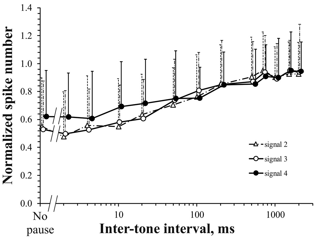 При обработке данных подсчитывали число спайков во временном интервале действия каждого из четырех тональных сигналов, составляющих серию. Оценку временной динамики адаптации выполняли путем построения зависимости числа спайков в ответе нейрона от интервала между сигналами (кривые восстановления ответа). При статистической обработке данных использовали пакет программ Sigma Plot 11.0 (ANOVA on ranks, Dunn’s test, p < 0.01).