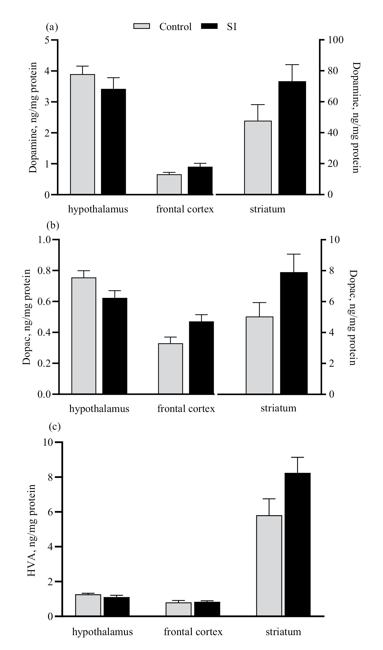 Методом ВЭЖХ определяли содержание дофамина, DOPAC (3,4-Dihydroxyphenylacetic acid, 3,4-диоксифенилуксусная кислота) и HVA (Homovanillic acid, гомованилиновая кислота) в гипоталамусе, фронтальной коре и стриатуме по протоколу, описанному ранее [31]. После добавления аликвоты гомогената ткани мозга (50 мкл) в эппендорф с 150 мкл 0.6 М хлорной кислоты (HClO4) пипетировали и центрифугировали 15 мин при 4ºС и 14000 об/мин для осаждения белка. Отбирали супернатант и разбавляли водой miliQ в 2 раза. Оставшийся осадок хранили при –20ºС для последующего определения белка методом Бредфорда. Для этого осадок растворяли в 1 мл 0.1M NaOH, концентрацию белка в полученном растворе определяли с помощью реактива Брэдфорда в двух повторах для каждого образца. Измерение концентрации белка проводили с помощью спектрофотометра MultiScan GO и программного обеспечения Thermo Scientific SkanIt (Thermo Fisher Inc. США). 20 мкл супернатанта вводили в петлю системы ВЭЖХ, которая состояла из следующих компонентов: электрохимический детектор (750 мВ, DECADE IITM; Antec, Нидерланды), проточный элемент из стеклоуглерода (ячейка VT-03, 3 мм GC sb; Antec, Нидерланды), системный контроллер CBM-20A, блок подачи растворителя LC-20AD, автоматический пробоотборник SIL-20A и дегазатор DGU-20A5R (Shimadzu Corporation, США). Хроматографическое разделение веществ осуществляли в изократическом режиме элюирования при скорости потока 0.6 мл/мин на колонке C18 (размер частиц 5 мкм, L × ID 75 × 4.6 мм, Luna, Penomenex, США), защищенной предколонкой C8 (Penomenex, США). Подвижная фаза состояла из 87% буфера, содержащего 50 мМ дигидроортофосфата калия (Sigma Aldrich, США), 1.4 мМ натриевой соли октансульфоновой кислоты (Chimmed, Россия) и 0.05 мМ этилендиаминтетрауксусной кислоты (Sigma Aldrich, США) рН 3.9, и 13% метанола (Chimmed, Россия). Для построения калибровочной кривой внешних стандартов использовали серию растворов, содержащих по 0.5, или 1, или 2 нг дофамина, DOPAC и HVA (Sigma Aldrich, США). Площадь пиков была оценена при помощи программы LabSolution LG/GC (Shimadzu, США) и калибрована на соответствующий внешний стандарт. Концентрации биогенных аминов выражали в нг/мг белка, как было описано ранее [31].