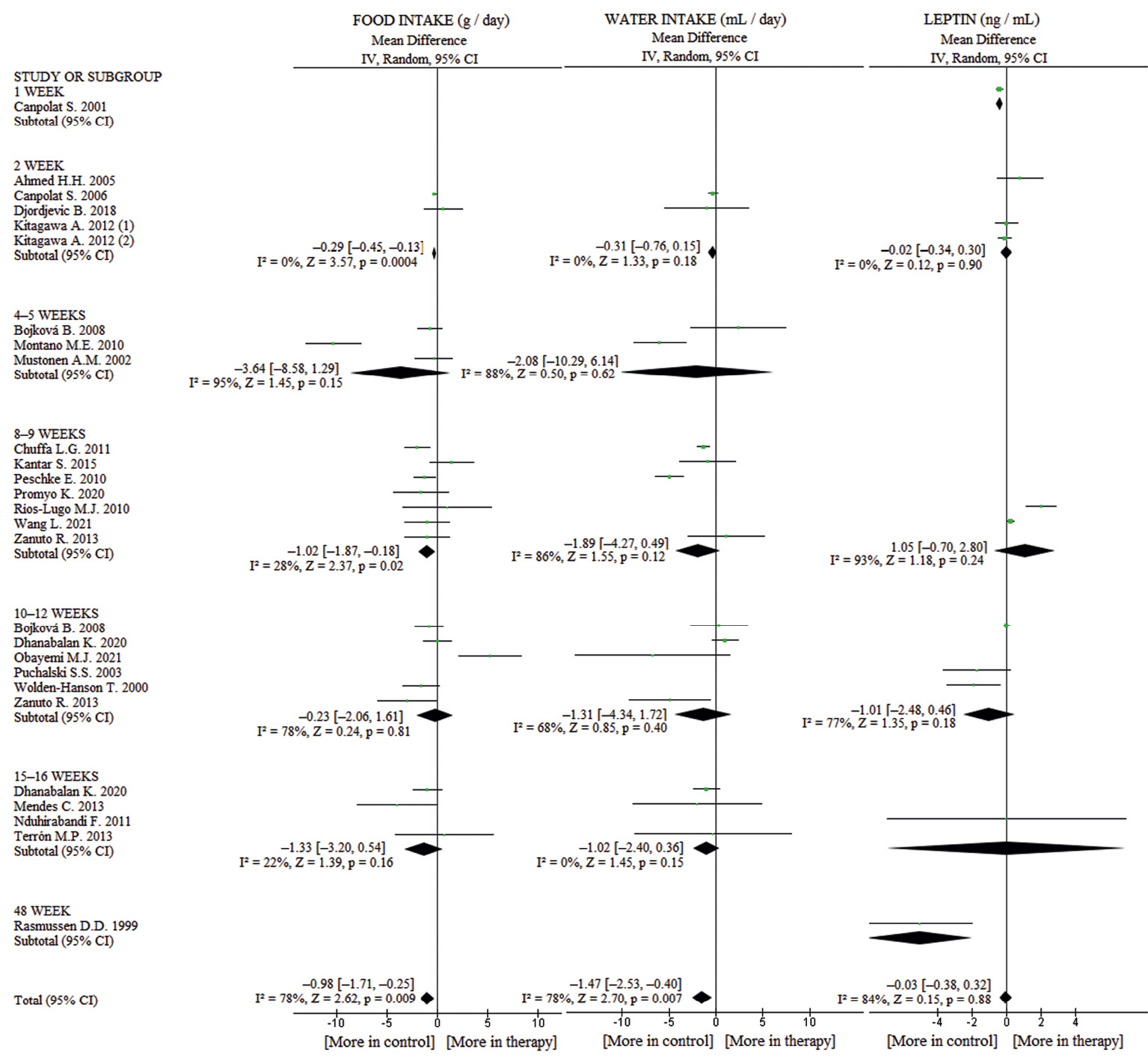 У контрольных крыс, содержащихся на жирной диете, потребление пищи было 25.2 ± ± 16.9 г/день, воды – 30.8 ± 2.8 мл/день. По результатам 4 работ терапия мелатонином незначительно уменьшала потребление корма, но не воды (рис. 5). У крыс, содержащихся на жирной диете, уровень лептина имел разброс от 7 [18] до 21 нг/мл [55] (медиана – 19 нг/мл) и существенно снижался при введении мелатонина дольше 2 недель на –4.28 [–8.04, –0.53] нг/мл (I² = 83%, Z = 2.24, p = 0.03) (рис. 5).