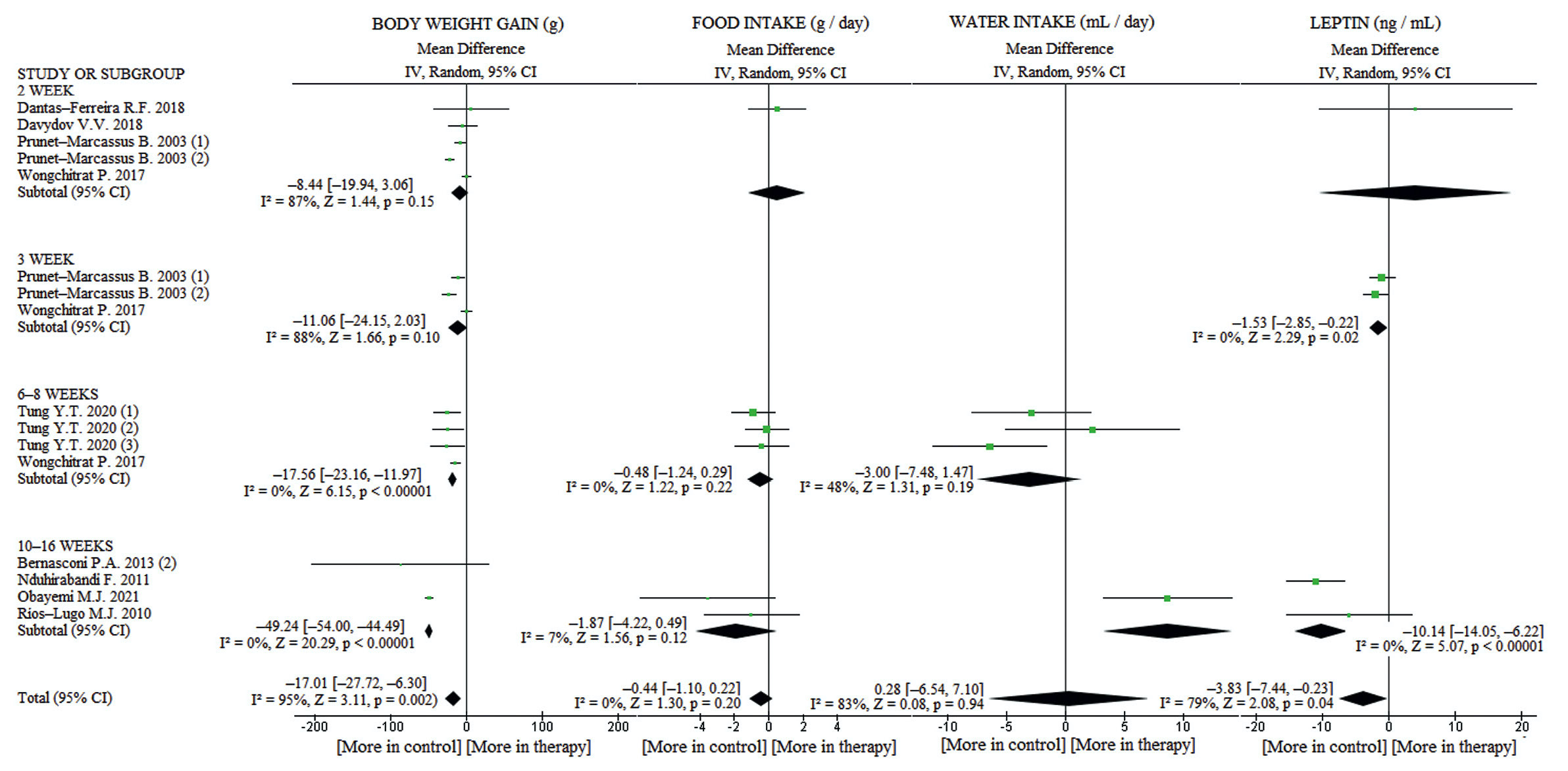 Из отобранных работ мы извлекали данные по массе тела крыс (в граммах) в начале и конце/на этапе терапии, затем рассчитывали в граммах ПМТ (как разницу между массой тела в конце/на этапе терапии и массой тела перед началом терапии). Кроме того, были извлечены данные по количеству потребляемой пищи (в г/день) и количеству потребляемой воды (в мл/день) в контрольной группе и в группе животных, которые принимали мелатонин. Также были извлечены данные по уровню лептина, адипонектина и грелина. Если данные были представлены отдельно для самцов и самок, то мы рассчитывали среднее арифметическое.