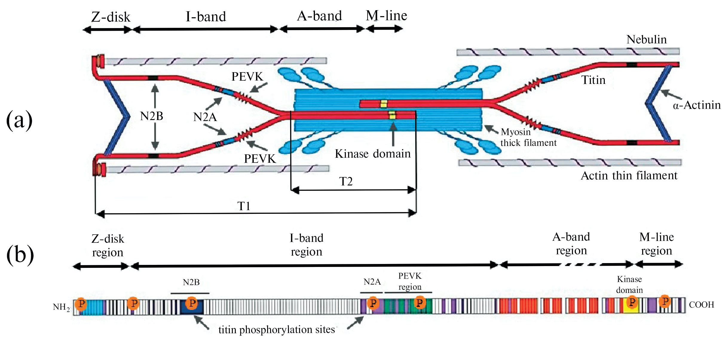 Рис. 1. Схема расположения титина в саркомере и его доменная структура. (a) – cхематическое изображение расположения молекул титина в саркомере. Полноразмерные молекулы титина, получившие название Т1, перекрывают расстояние от М-линии до Z-диска в саркомерах поперечно-полосатых мышц позвоночных. Часть молекулы титина, расположенная в А-зоне, получила название Т2. На каждую миозиновую нить в половине саркомера приходится, предположительно, по шесть полноразмерных молекул титина. (b) – доменная структура титина. Указаны домены титина (N2B, N2A, PEVK, киназный домен), а также участки фосфорилирования молекулы титина, расположенные в М-линии, I-зоне и Z-диске. Адаптировано из [3].